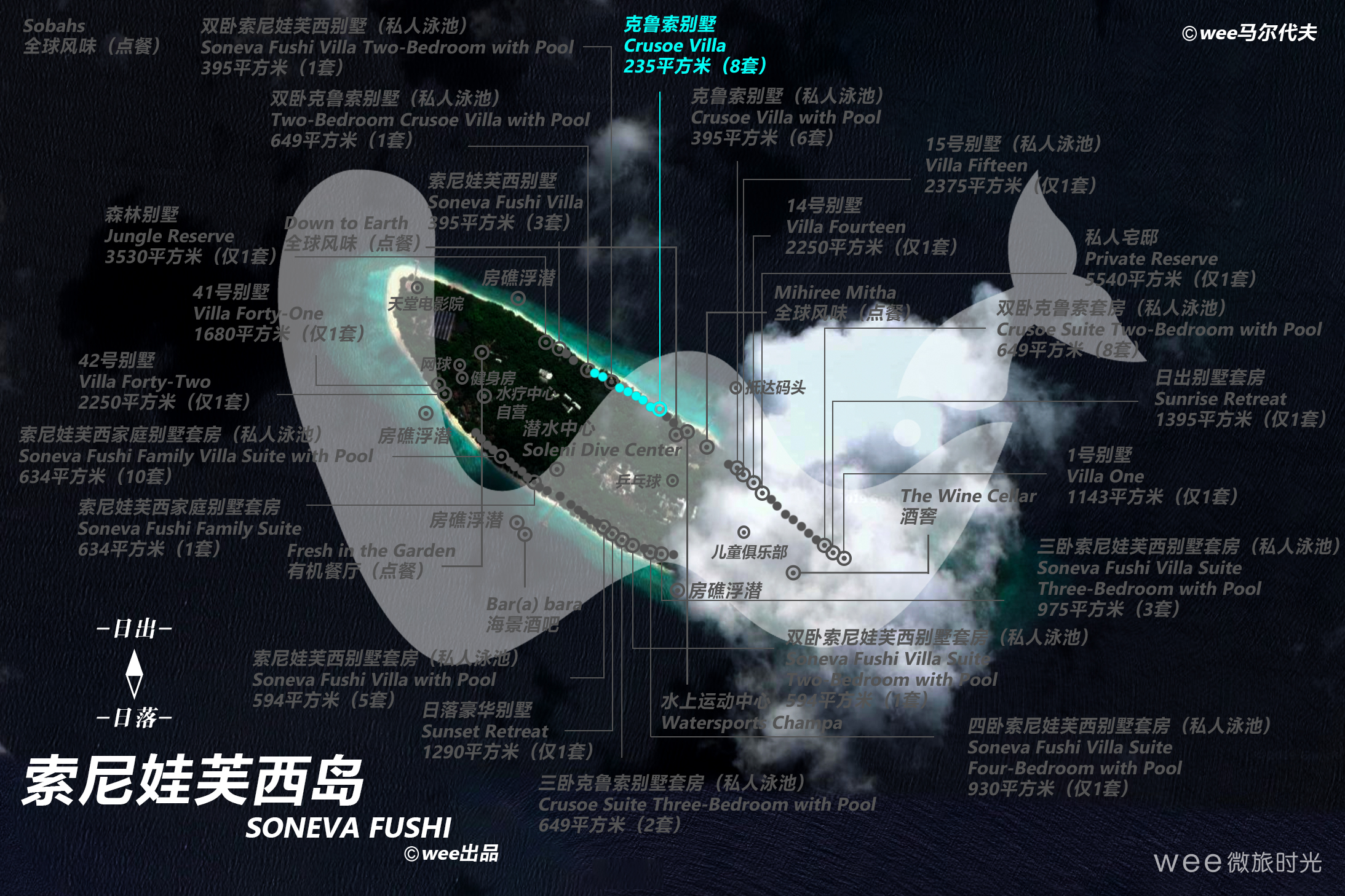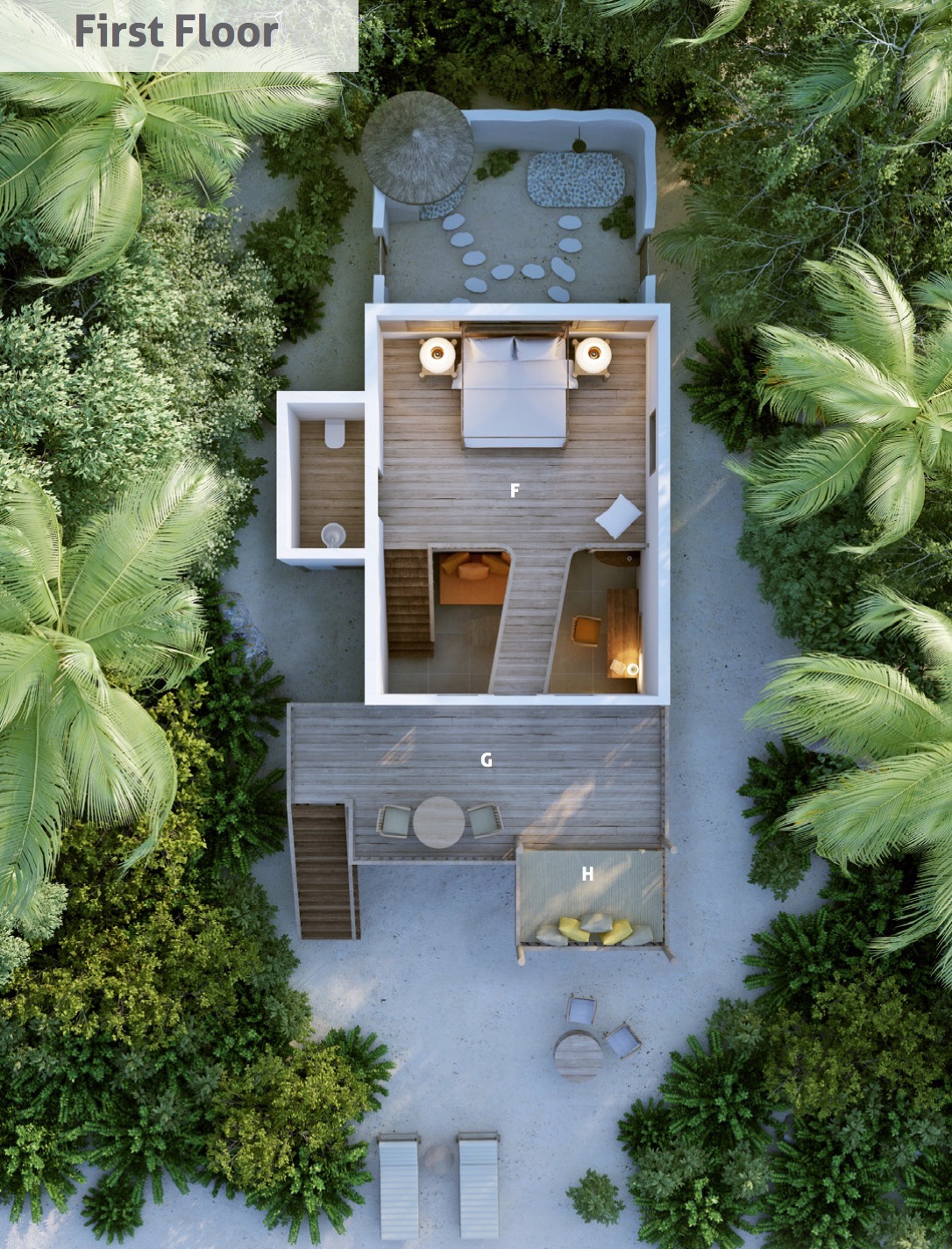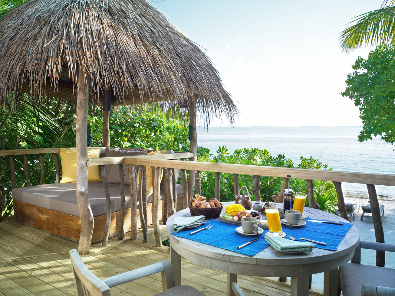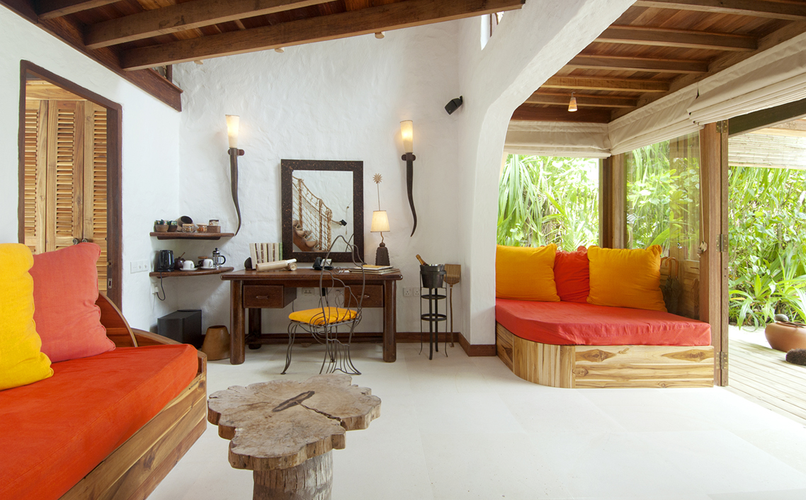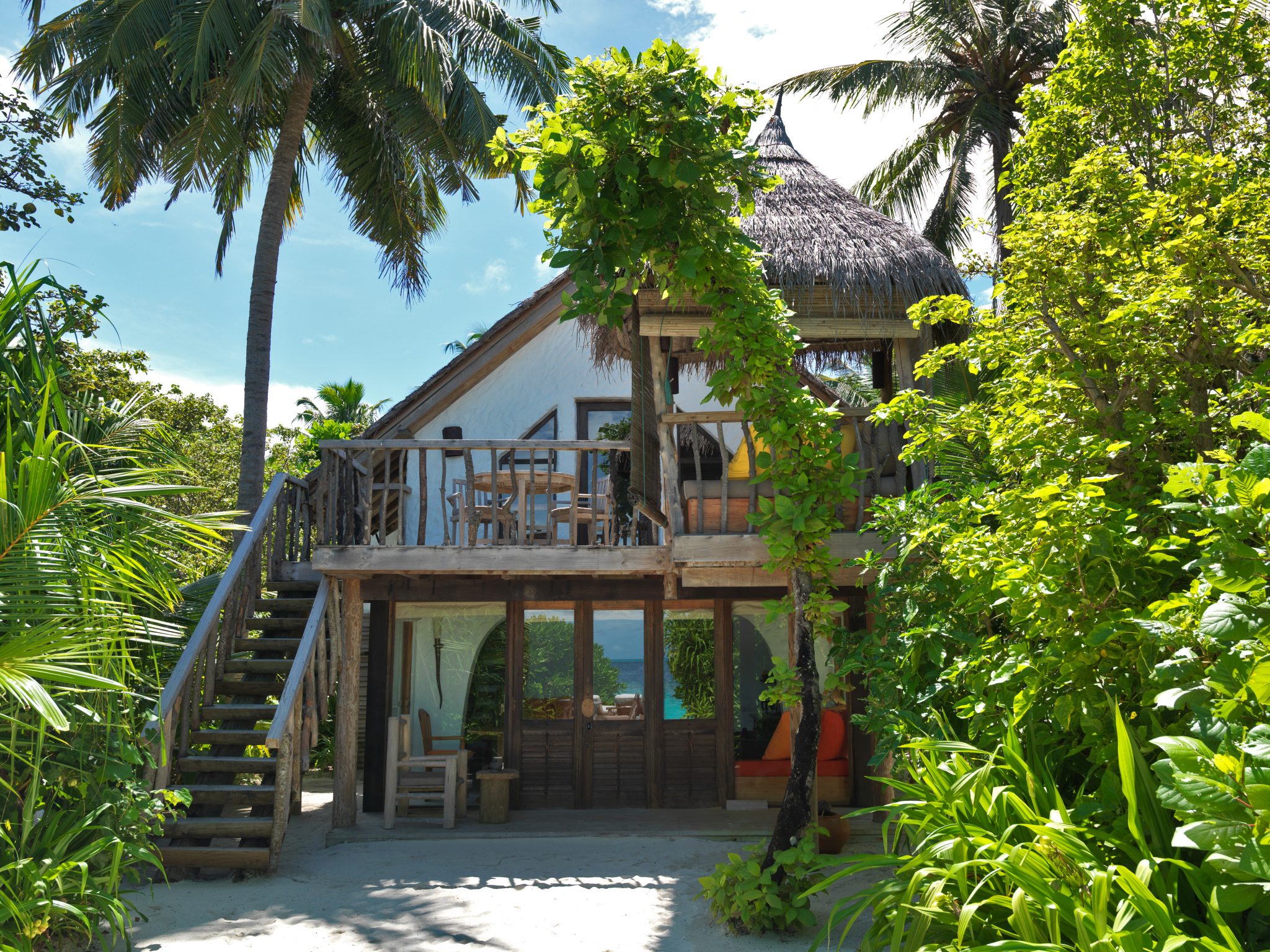 Crusoe Villa 别墅的命名及设计灵感来自鲁滨逊克鲁索的漂流经历。绳索吊桥引人通往热带风情洋溢的露台。花园卫生间给客户带来在阳光下或星辰下淋浴的体验,出门走几步便是沙滩。这一私密庇护所立于白沙之上,藏于绿丛之间,且被自然美景环绕。早早起床,从这里能看到美美的日出。
