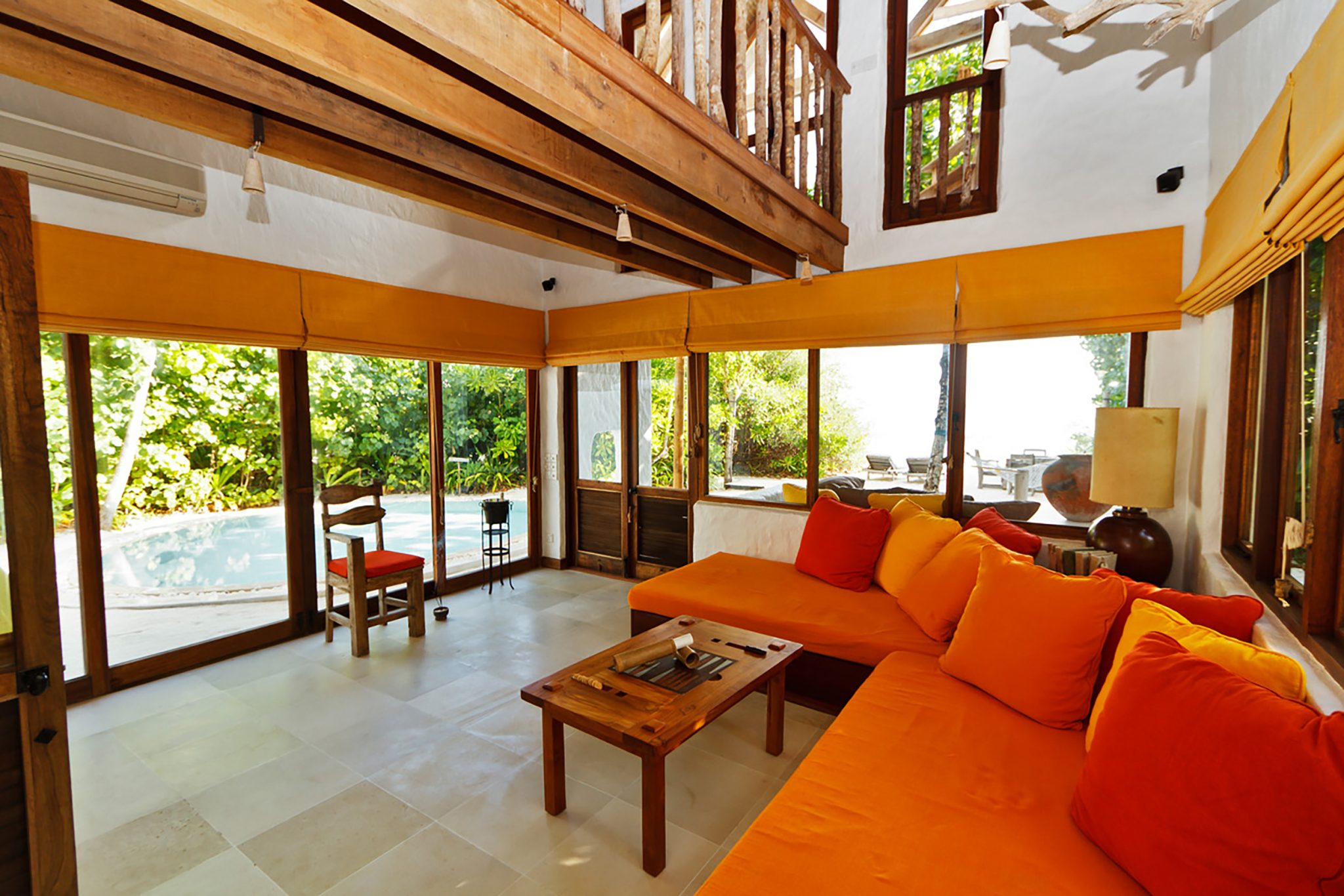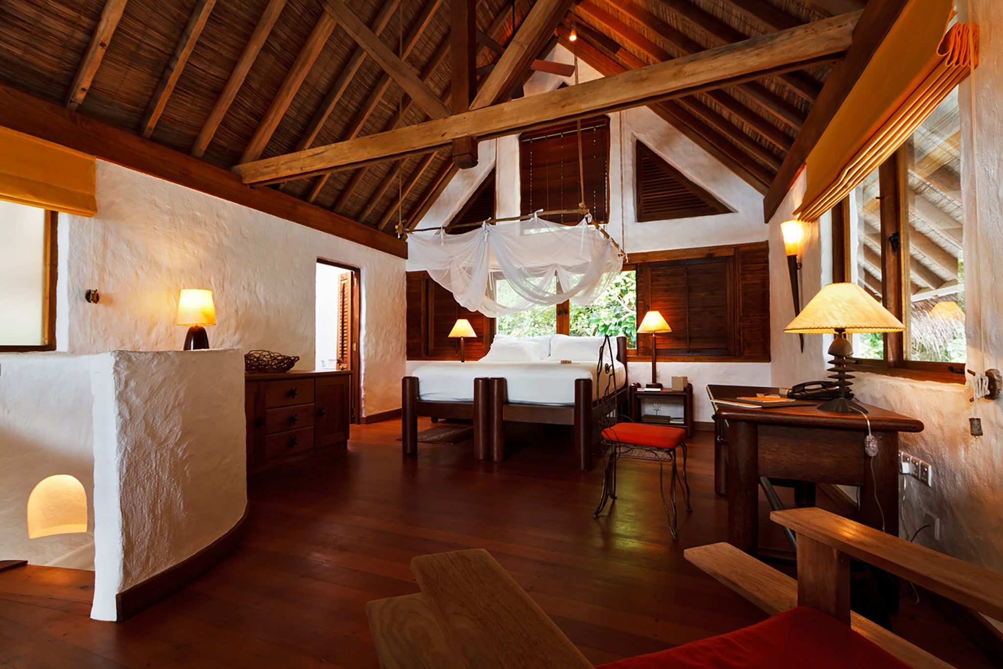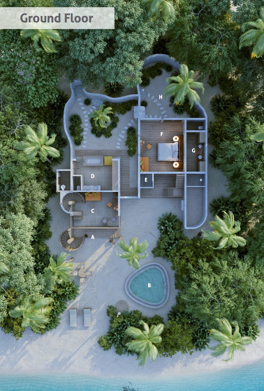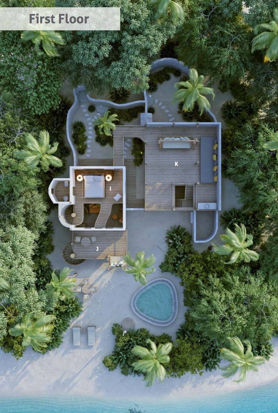 这一别墅充分利用热带地区的风格设计:选用带有木节和弯曲的原木、编制的草绳、回收再利用的板条以及棕榈茅草。室外花园浴室可在星光或日光下沐浴,拉近人与自然的距离。在露台高高低低的台阶上偷个懒,纵身跳入私人泳池,或在门阶外的沙滩上休憩,可充分体会到鲁滨逊·克鲁索的精神。