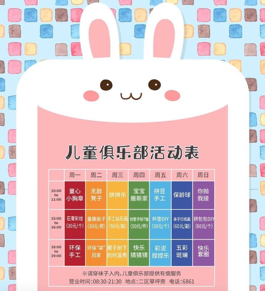 2、儿童的一部分玩乐活动项目是需要收费的,例如一区的一些玩乐设施、一些主题活动、夏令营的一些安排等。