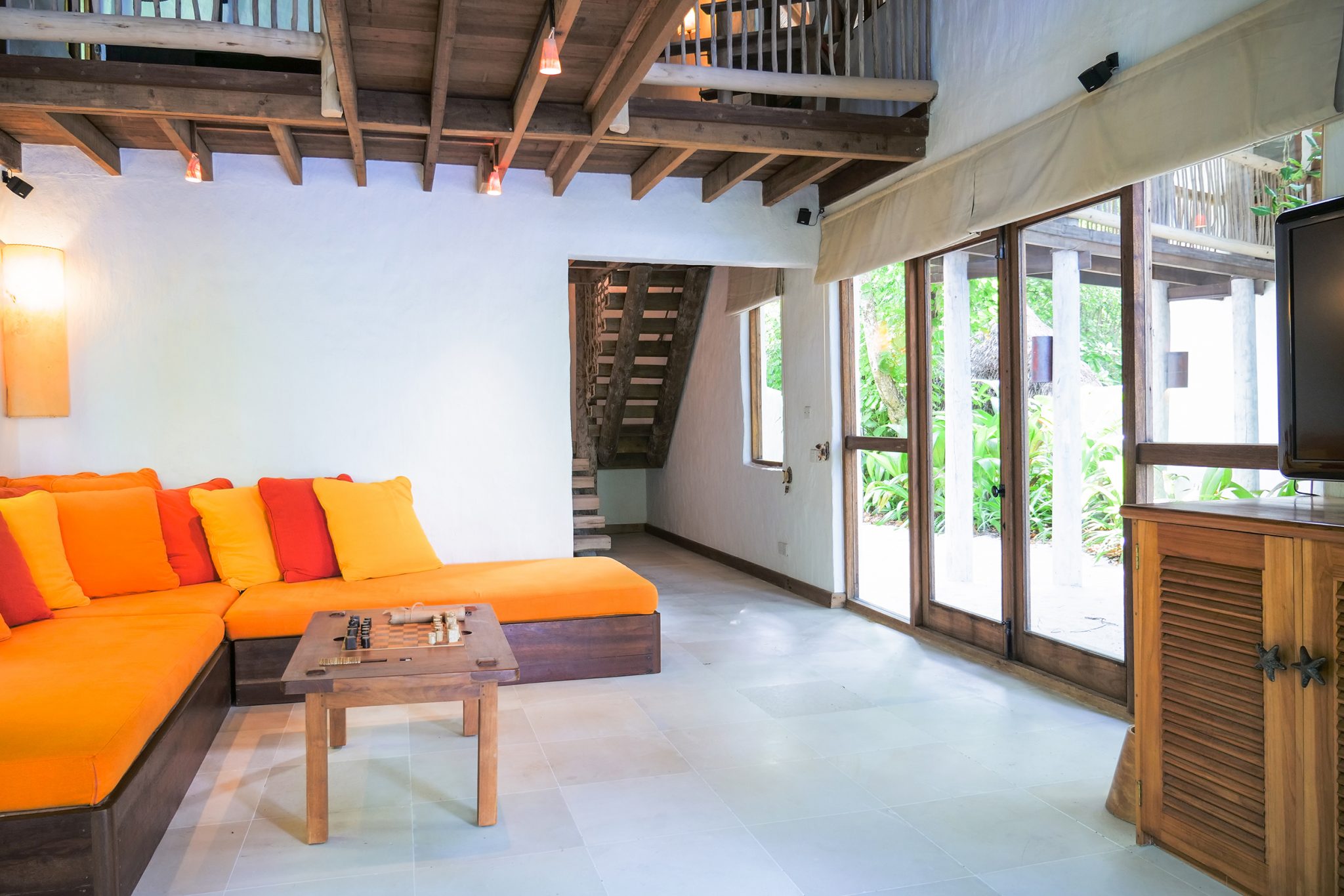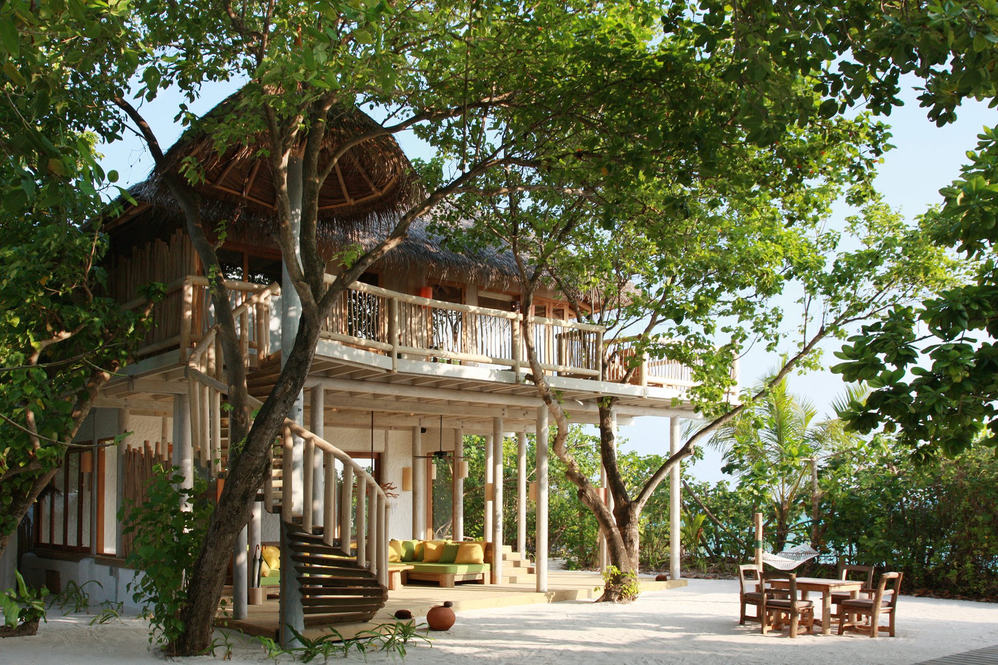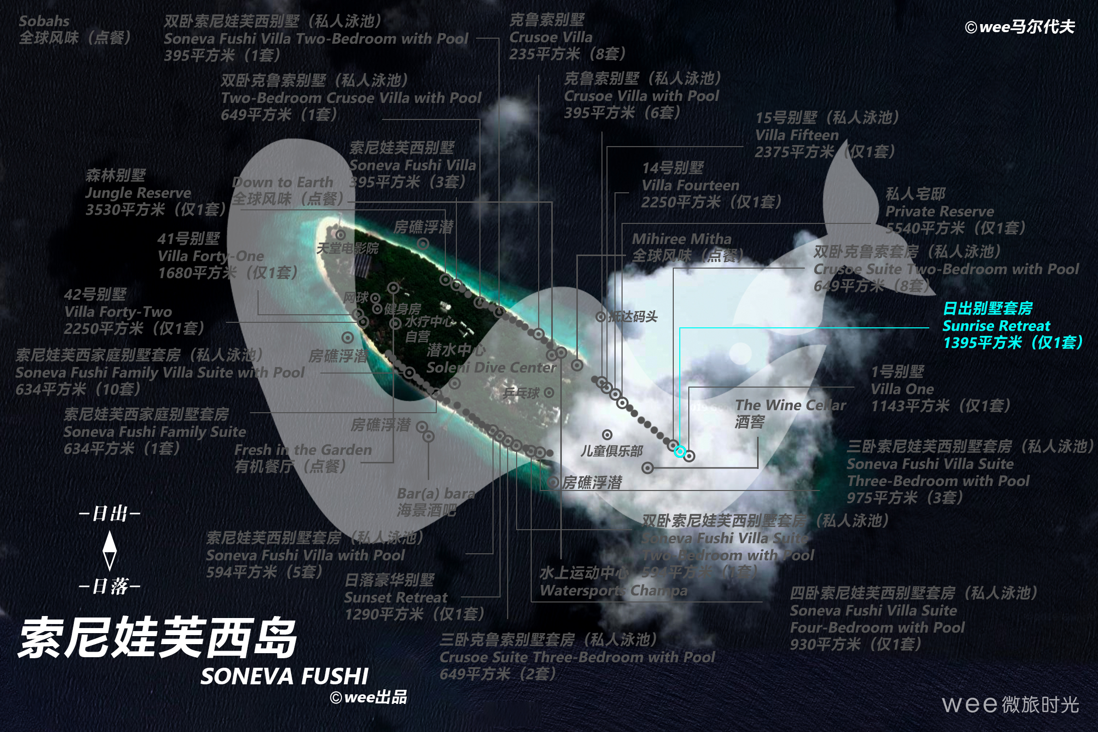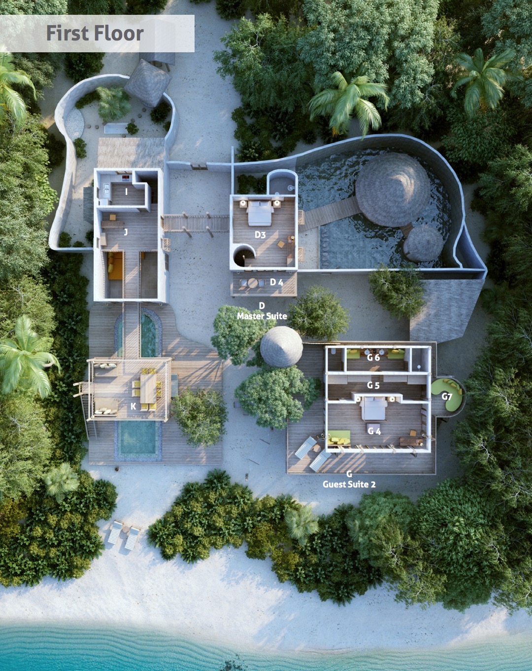 海上日出具有一种魔力,这一奢华宽敞的别墅套房位于海岛最优越的地理位置之一,可以在此破晓时分感受无限壮美。别墅套房的三栋平房均为两层构造,分布于过道两侧。