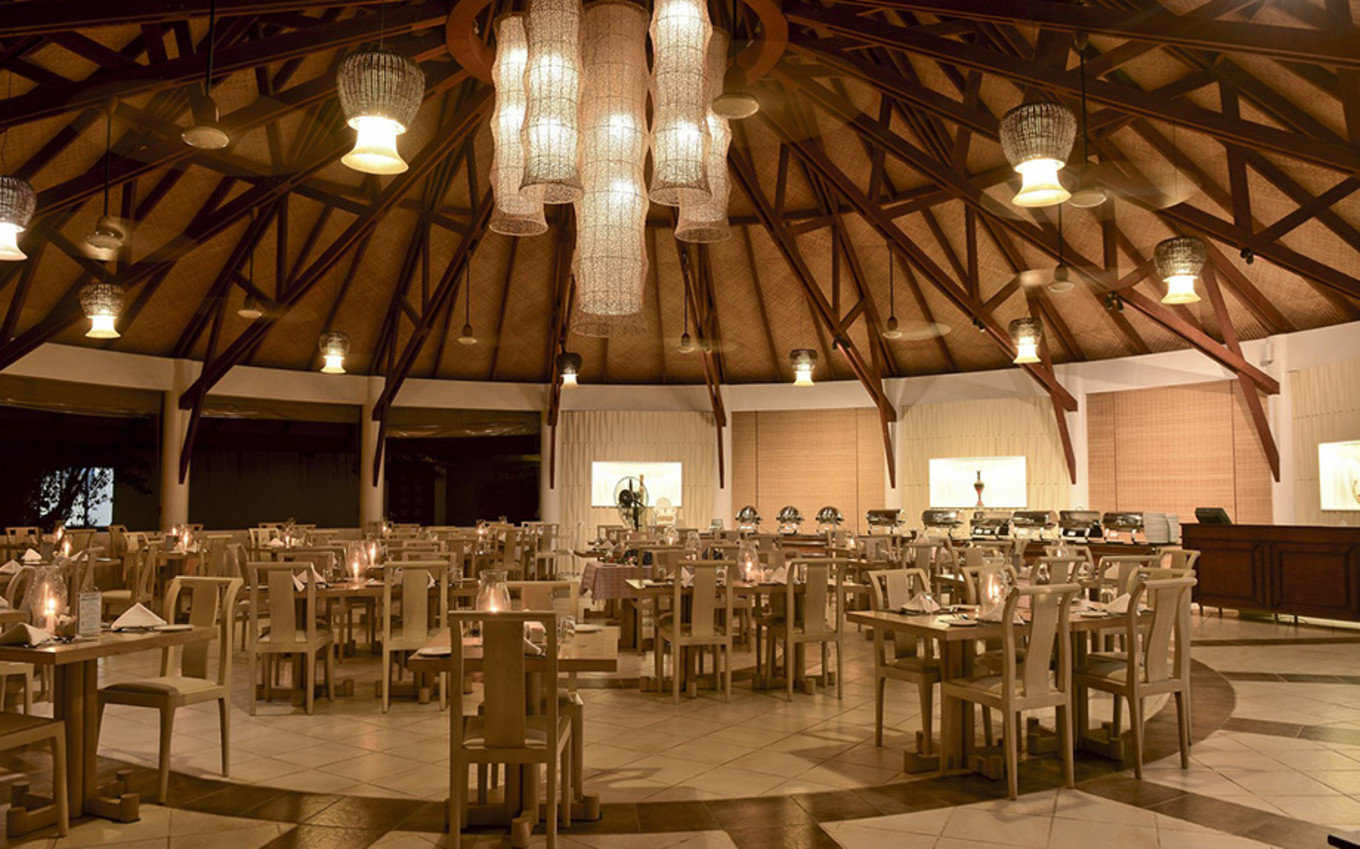供应早餐、午餐和晚餐,早餐茶饮免费,午晚餐饮品需单点。早餐都是自助,中午和晚上会有西式套餐。每晚有一道主菜,烤海鱼、火鸡、牛排、羊排等,烧烤类的食物偏多,每天会不同,三餐都是自助,为全岛客人提供服务。