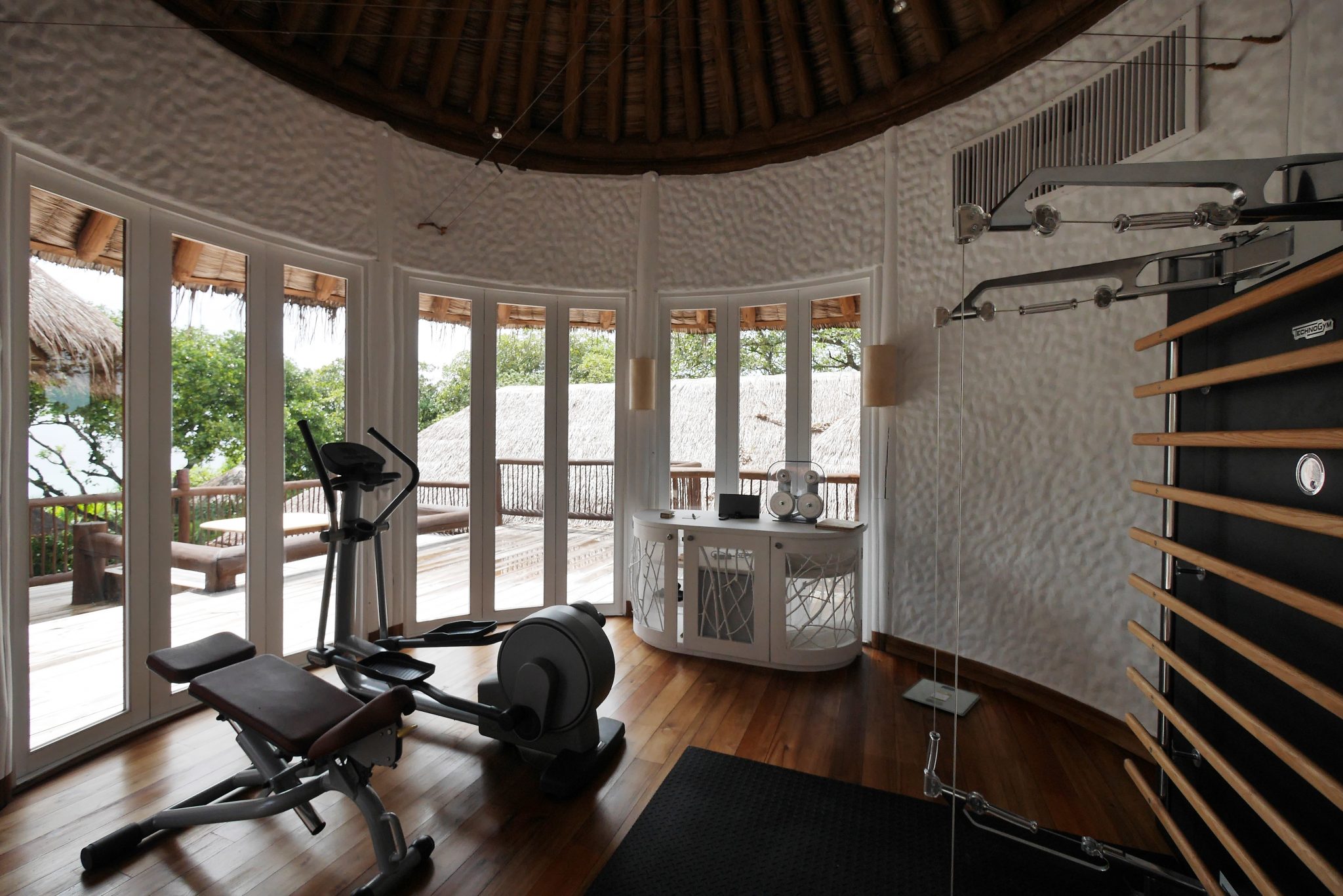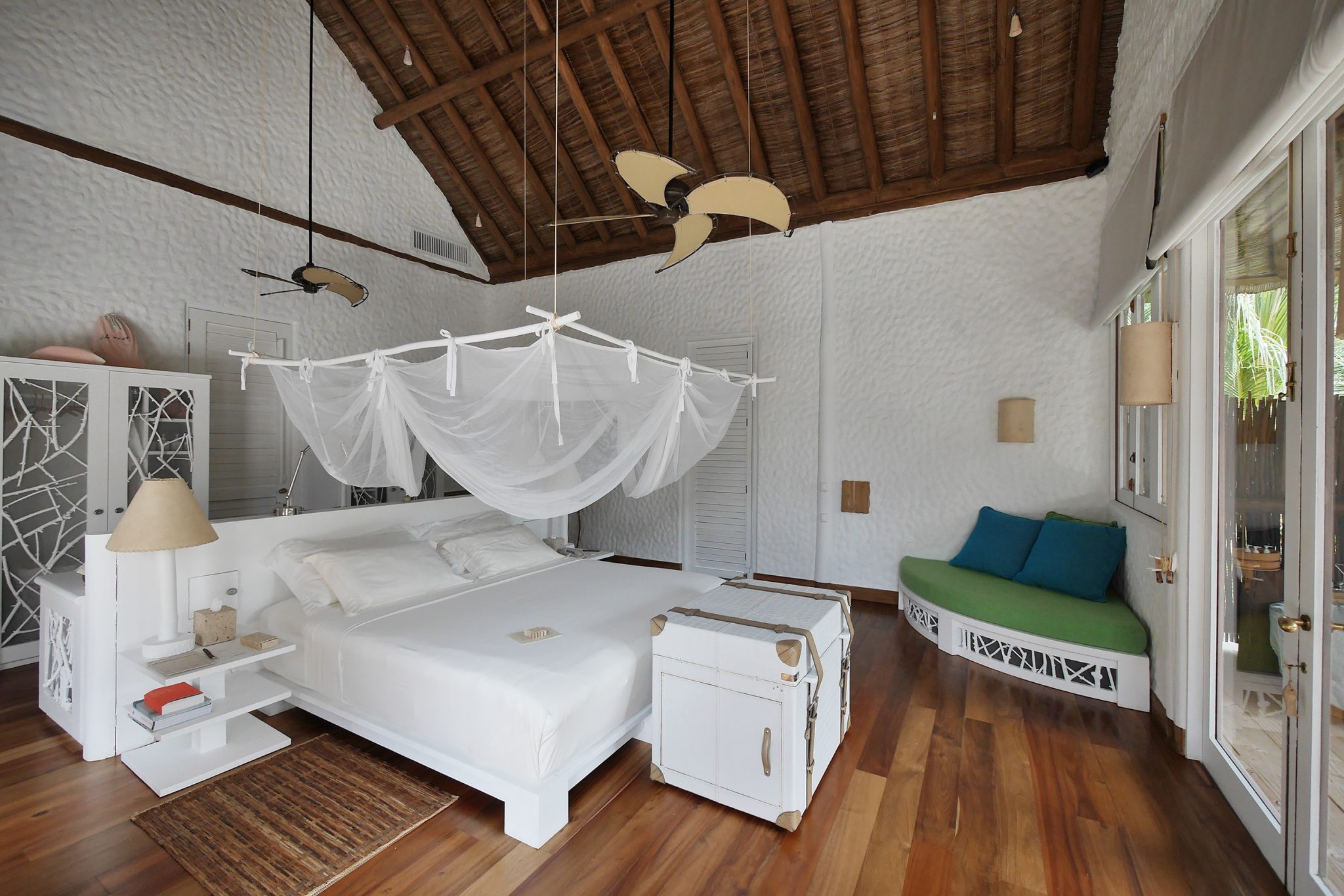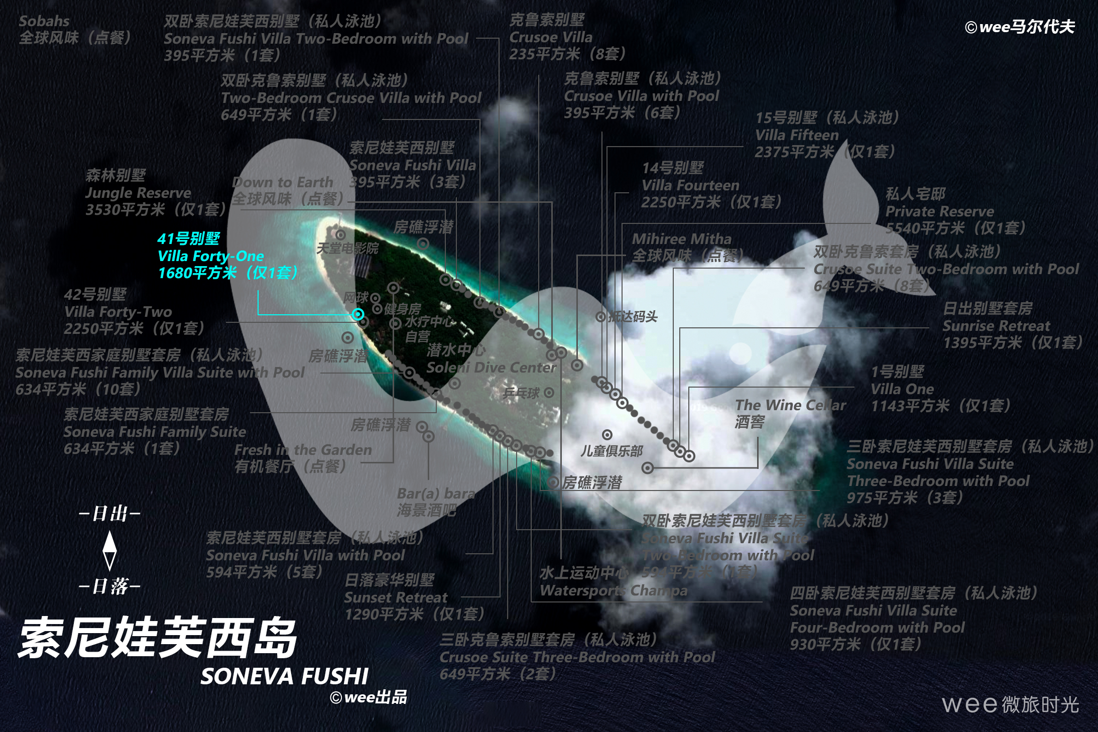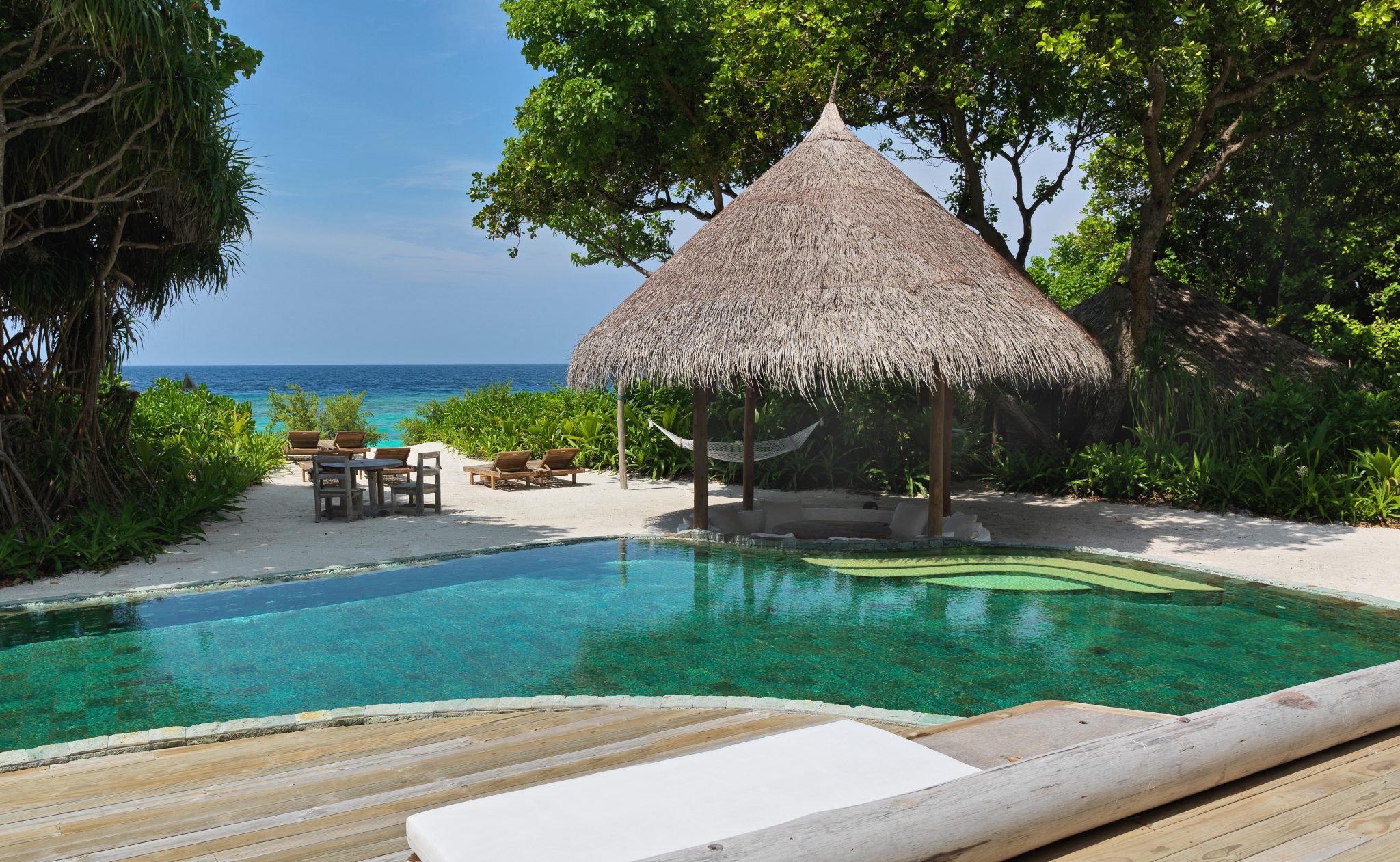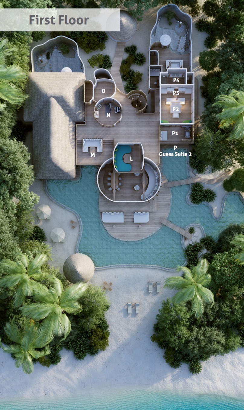 两个一楼卧室各自含有一个超大室外卫生间,卫生间都有天然瀑布,同时主卧室也配备有蒸汽设施的卫生间。跃入冷水池或私人泳池,然后去沙滩走走。在繁星缀满夜空时,体验夜晚的乐趣。慵懒的午后,则适合在电视休闲室消磨。这里距最佳的潜水地点和温暖的沙滩只有数步之遥。此别墅与42号别墅连通,构成一个9房别墅。
