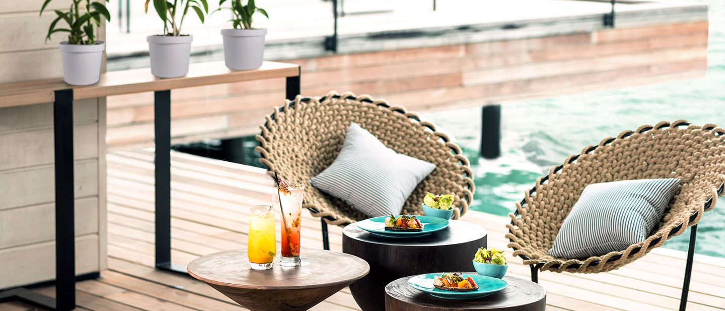 Deelani Bar酒吧在蔚蓝的氛围中提供精选的地中海风味鸡尾酒、冰冷的无酒精鸡尾酒和泡泡酒。