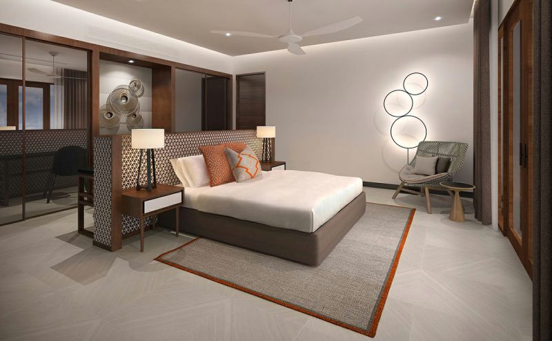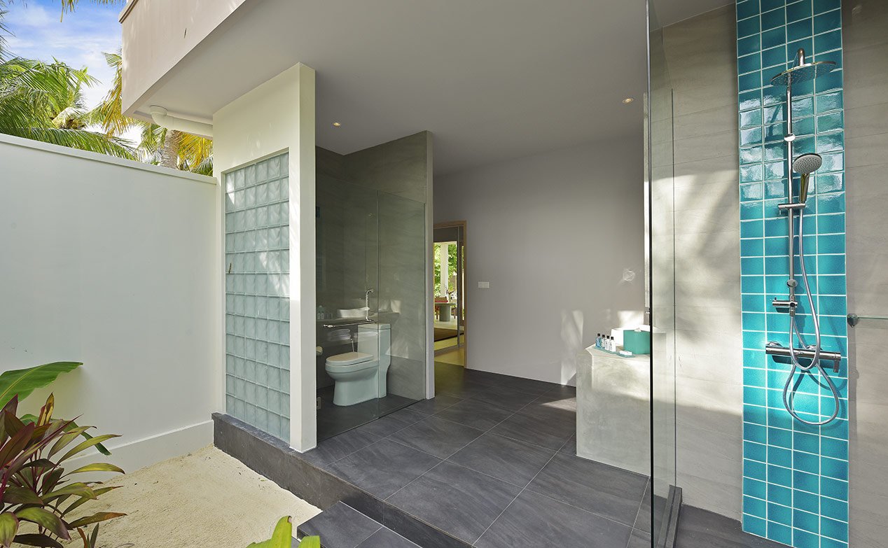 沙滩小屋背靠水面。隐藏在花园之中。20间海滩别墅鳞次栉比,每间客房均设有露天浴室+向天空开放的豪华花洒淋浴室,以及带日光躺椅的私人宽敞露台。