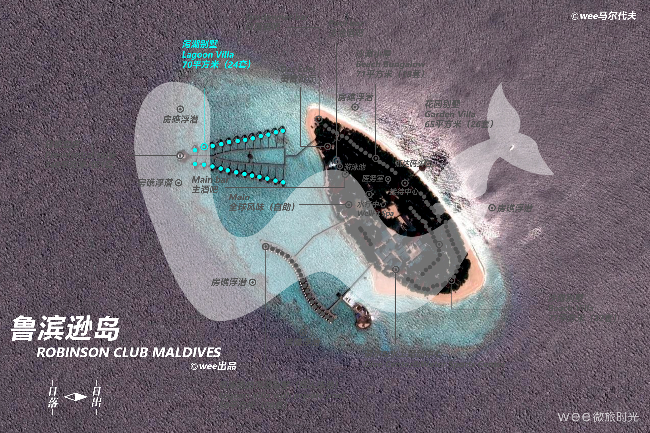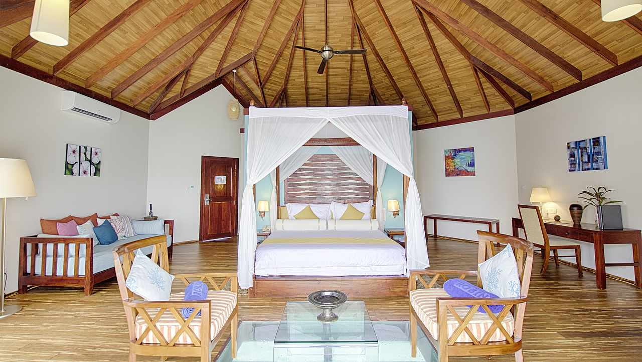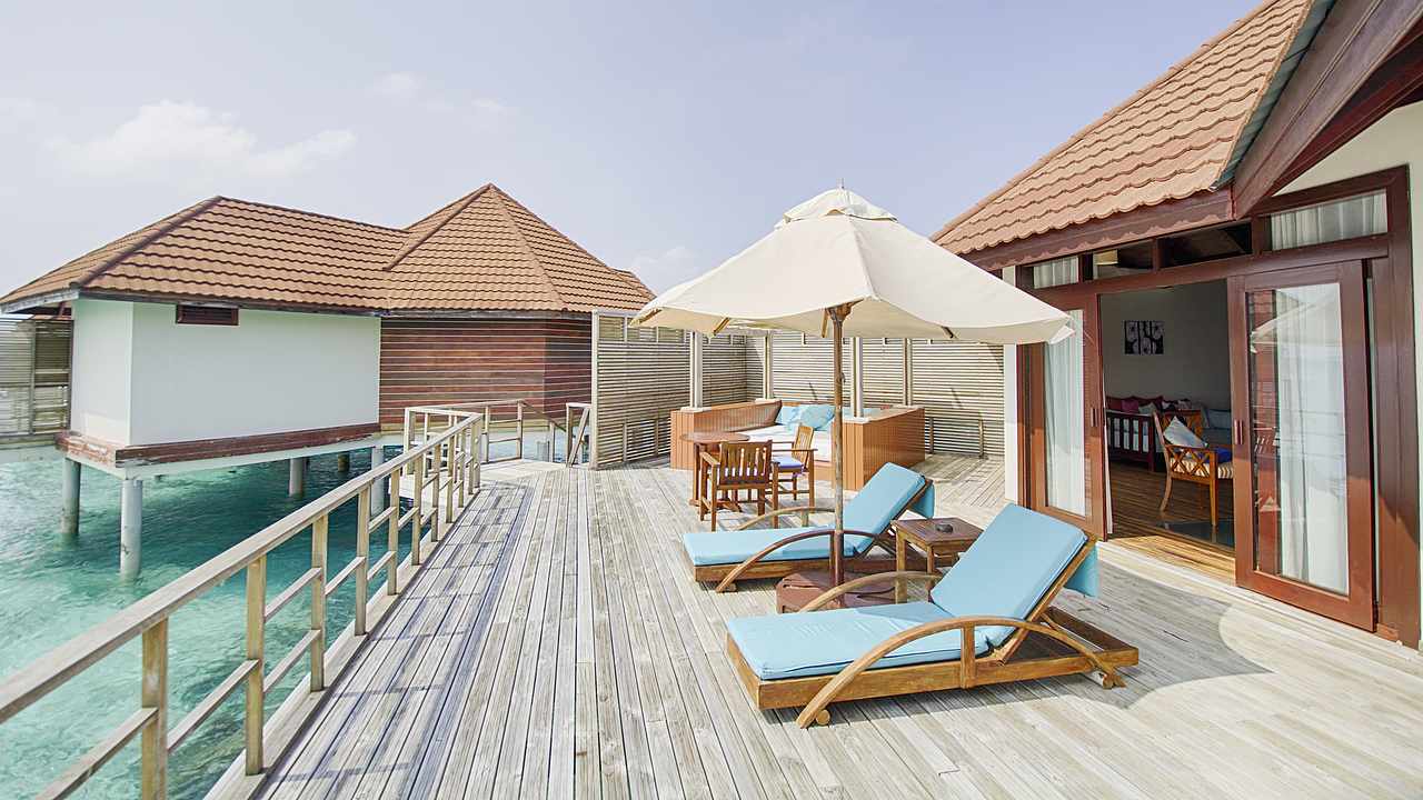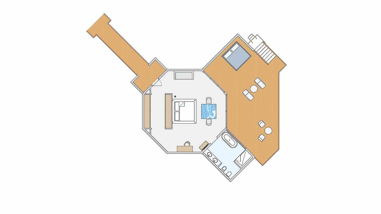 70平方米的露台可直接通往大海,俯瞰泻湖,设有一间卧室/起居室。二次装修后新增了一面玻璃地板,可以通过它直接欣赏到绚丽缤纷的海底生物。另外还有私人阳台,可以享受无限美好的下午时光或是走上几步去感受湛蓝的海水。