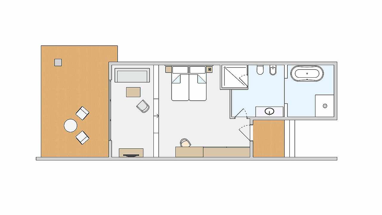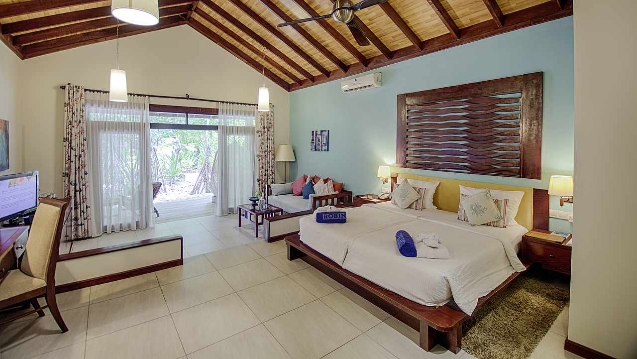 Garden Villa花园别墅,每间别墅都有私人宽敞露台,可以让客人在享受日光浴的同时,一览岛上的热带风光。除此之外每间别墅内还特别设置了一个室外花园雨水淋浴,可以让客人一边欣赏美景一边沐浴。
