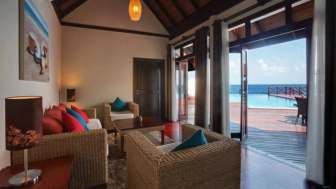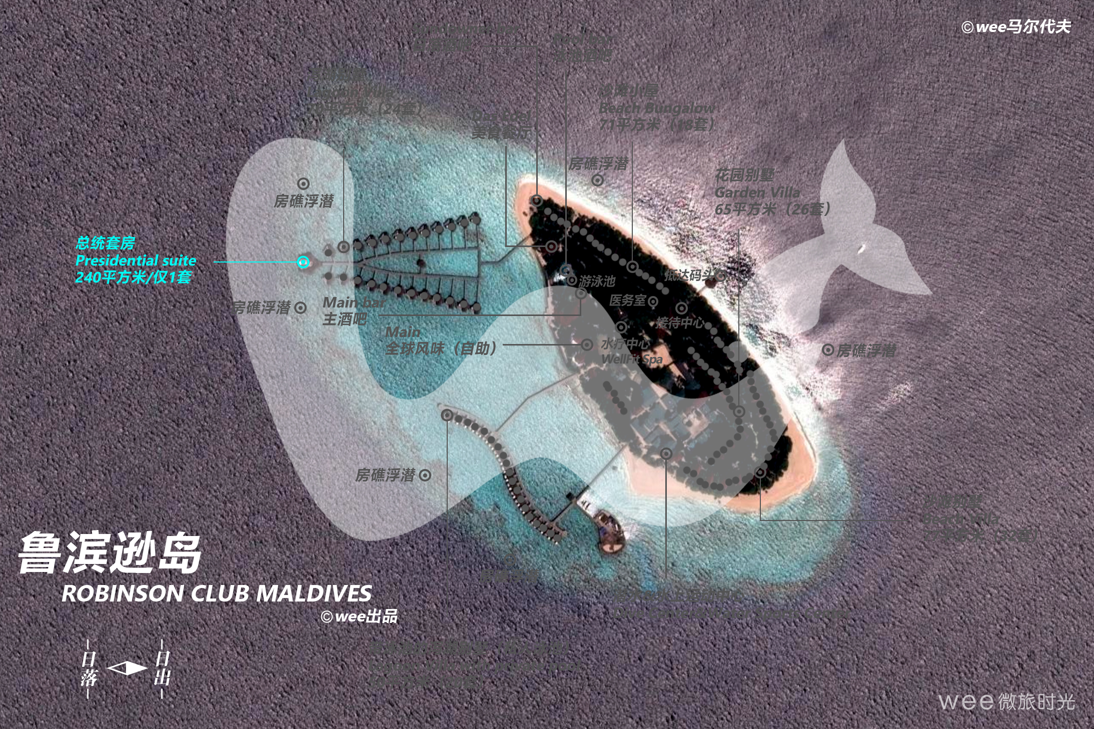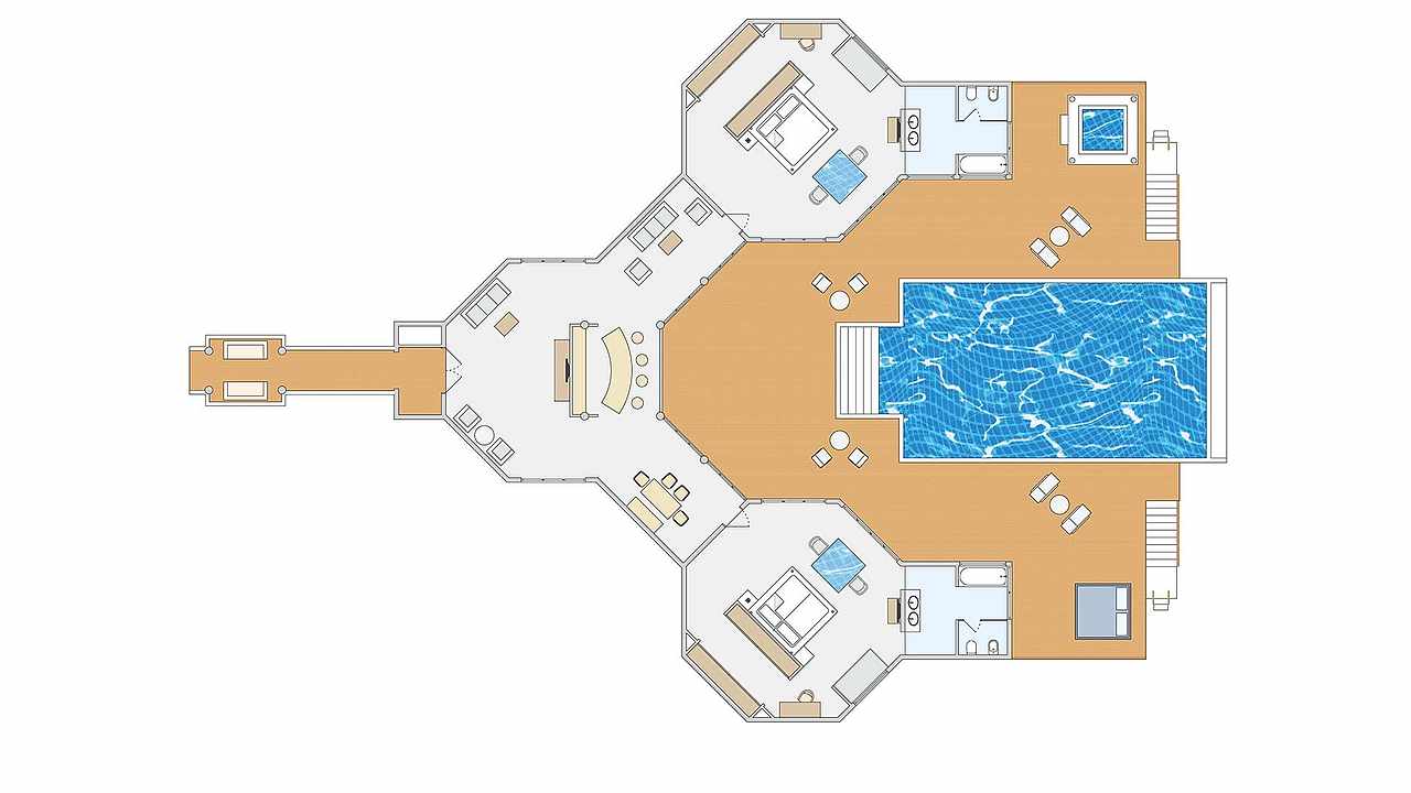 Presidential suite 总统套房是岛上最豪华也是面积最大的一个房型,并且只有一套,享有私人泻湖无敌海景,私密性好,充足的使用面积。
