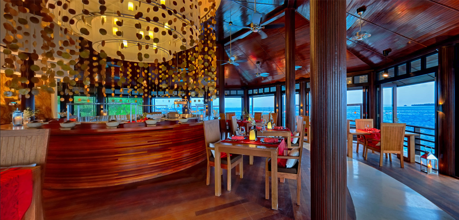 独特的户外用餐台可以体验马尔代夫水上用餐的感觉。感受被美食香气和马尔代夫绝美日落所笼罩的完美用餐氛围吧。