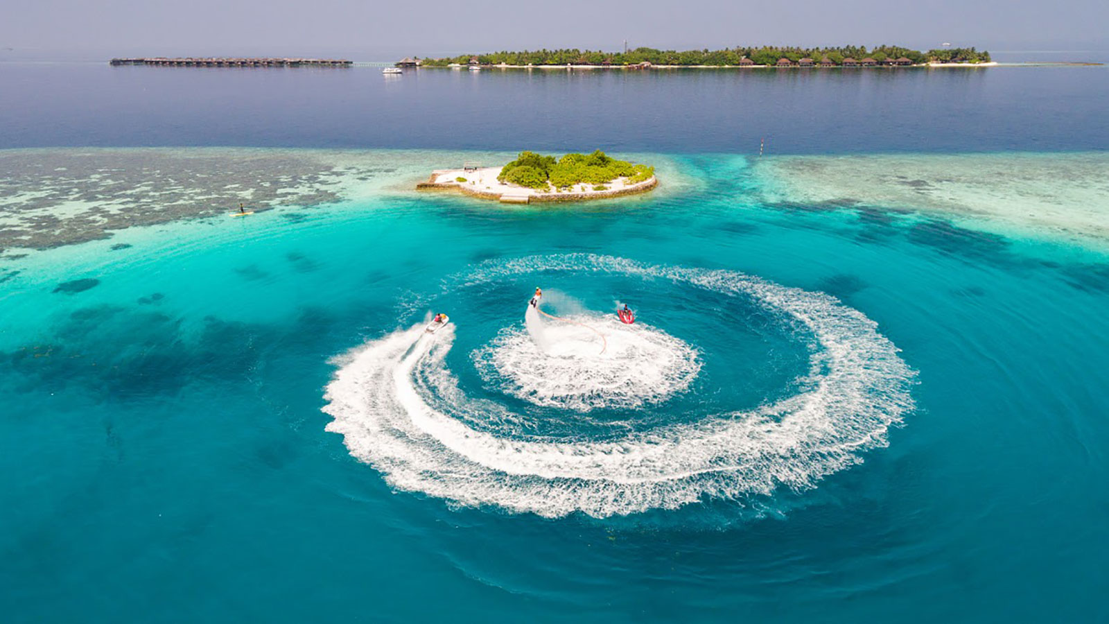 在马尔代夫平静和清澈的海面上驾驶摩托艇!水上摩托艇可以独自驾驶,也可以与水上运动团队的教练一起感受速度与激情。