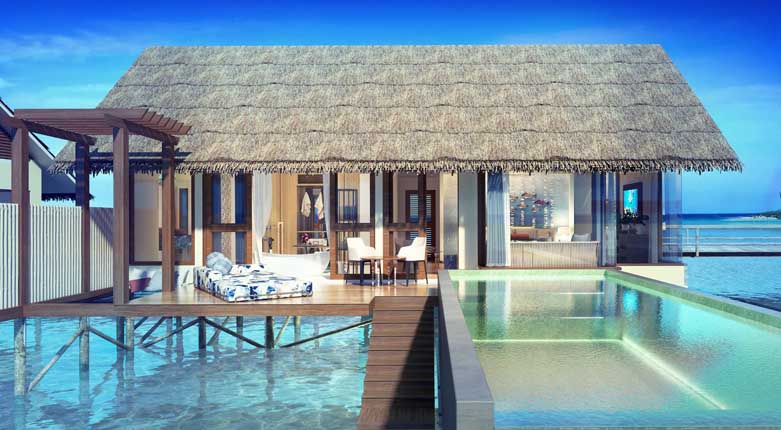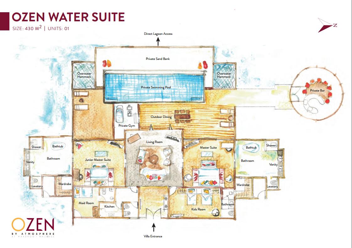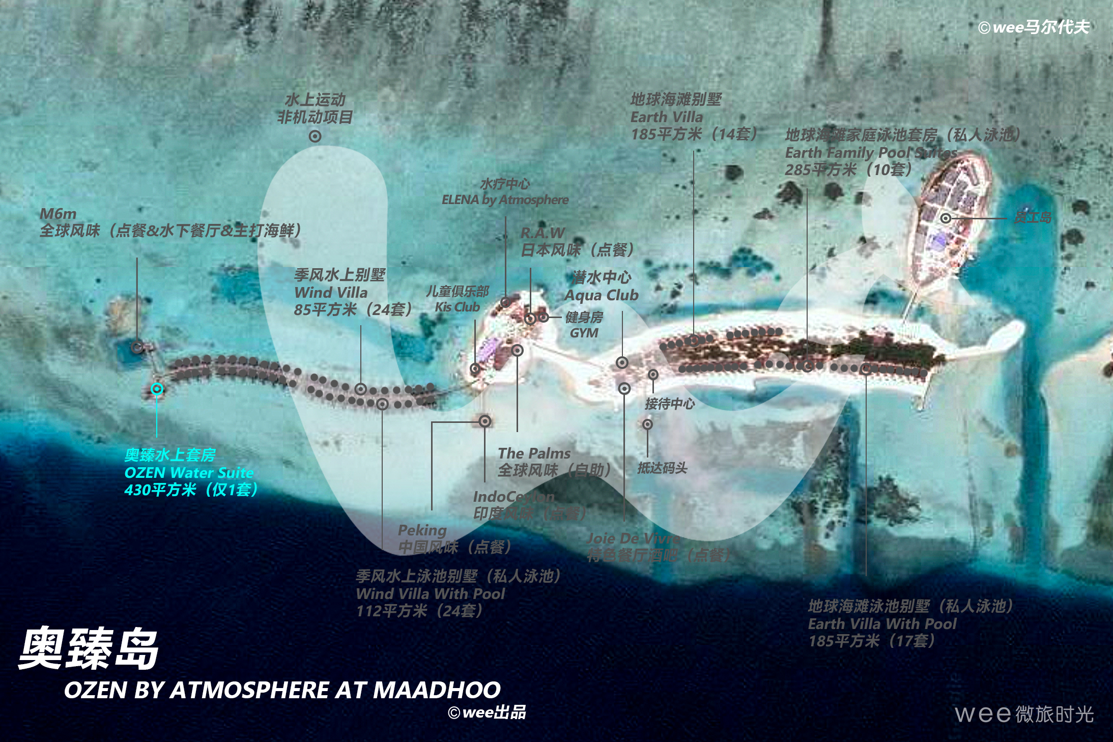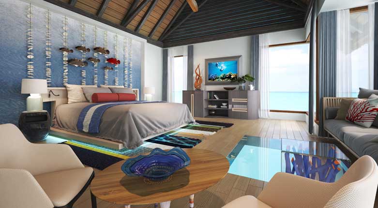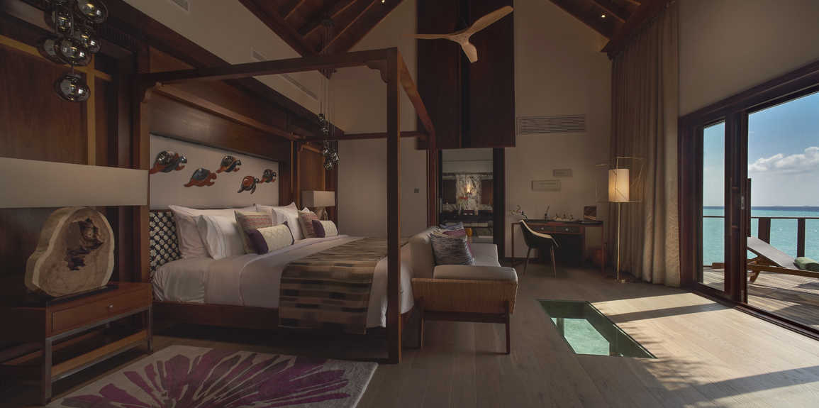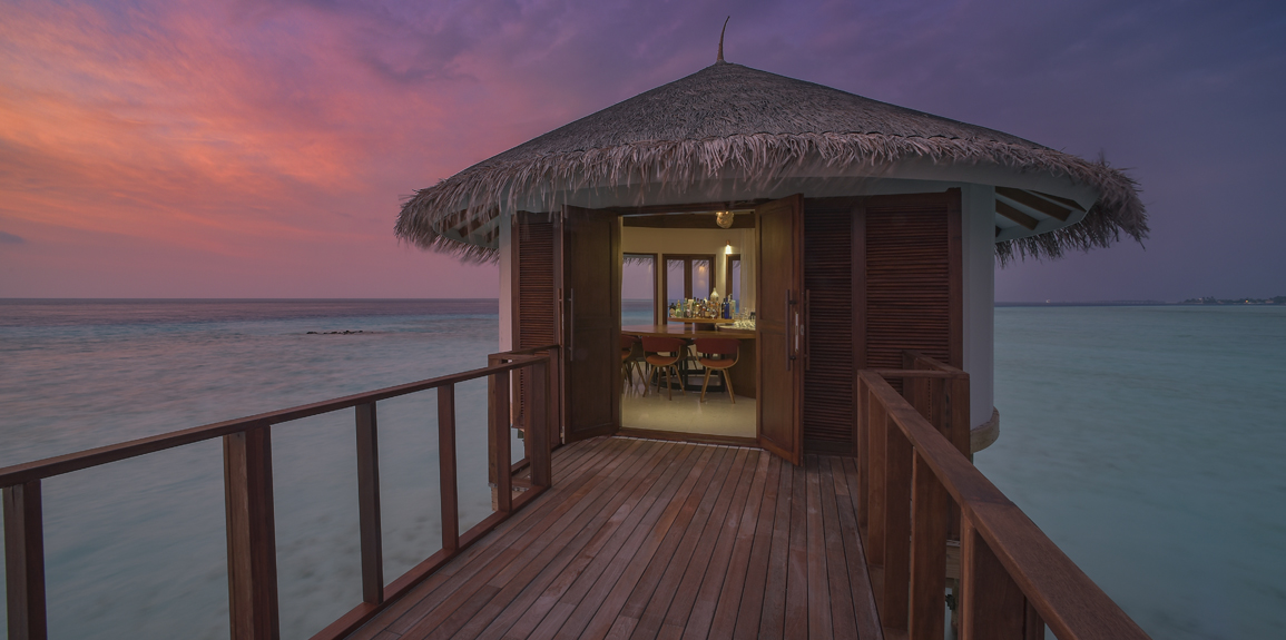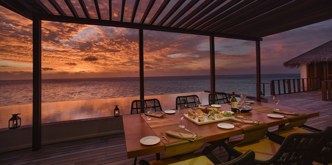 奥臻水上套房是全酒店最奢华的房型,这个豪华的水上套房坐落于码头顶端的位置,不管是欣赏日落还是海景,都是绝佳的位置。套房里拥有3间独立卧室,还有一个多达35平米的无边泳池,和一个私人健身房,还有一个独立的小厨房,同时室外也有私人的用餐区域。