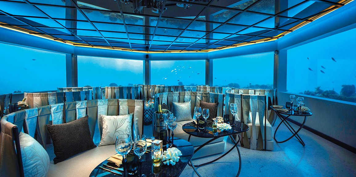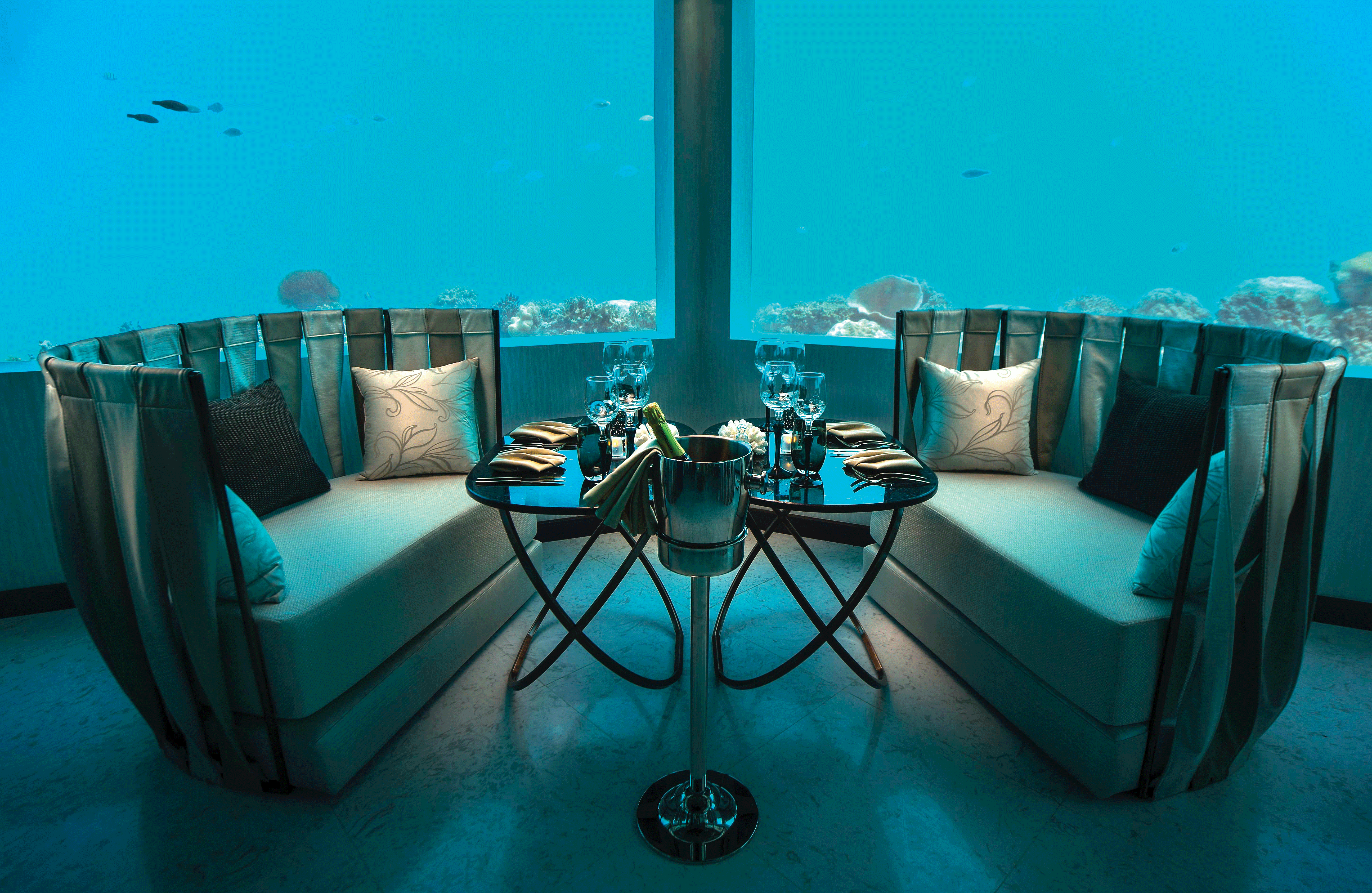 M6m是全马尔代夫为数不多的特色水下餐厅之一,在餐厅享用到可口牛排和龙虾料理的同时还能尽情领略令人惊叹的水下美景,主要提供牛排和龙虾类美食。