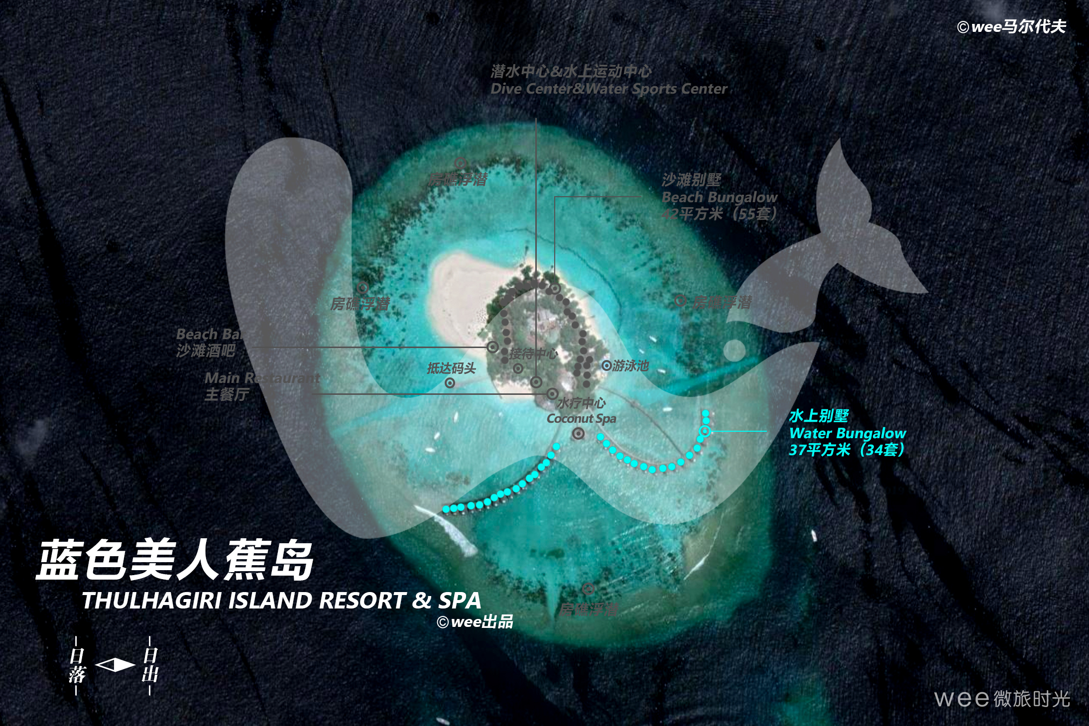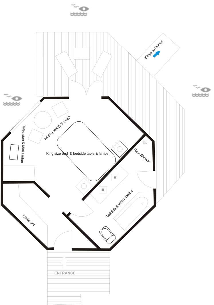 34间位于泻湖郊外的水上简易别墅设有一张特大号床和一个带阳台的现代化卫生间,可欣赏到广阔的不定式海洋,享有印度洋水晶般清澈的独特体验,可直接通往房礁。