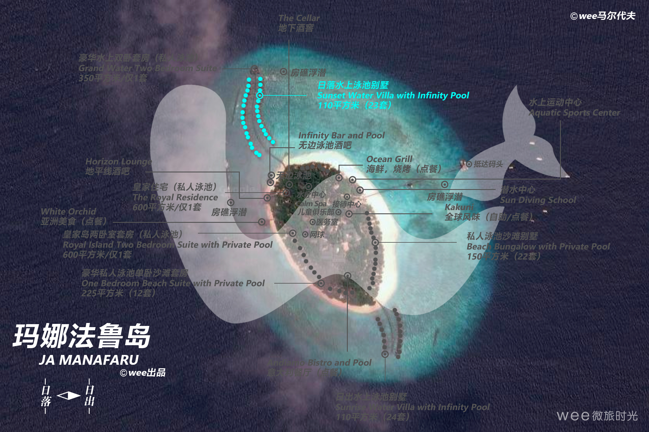 别墅享有迷人的日落美景,享有壮丽的水景,房间里可以通过地板上的玻璃面板欣赏不同的海洋生物,在无边泳池中放松身心,在豪华的室内环境中放松身心。日落水上别墅中,可以欣赏到无边泳池的景色,欣赏到彼此融合的充满活力的色彩。