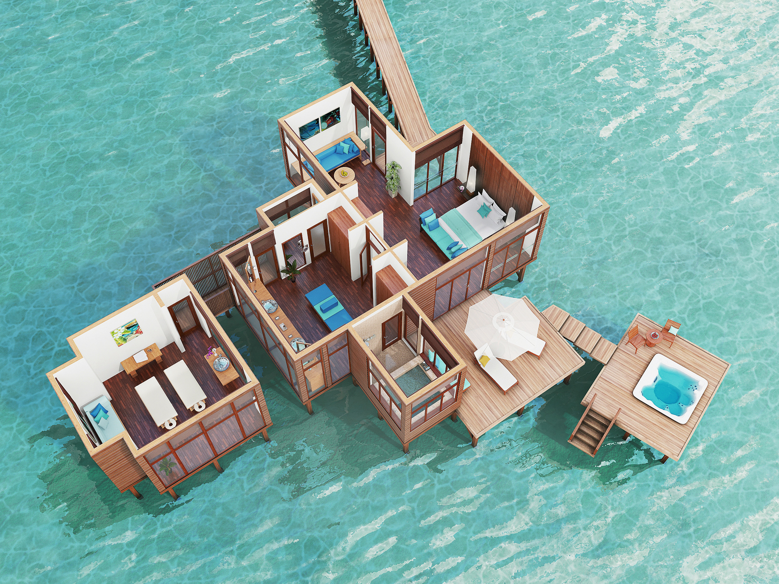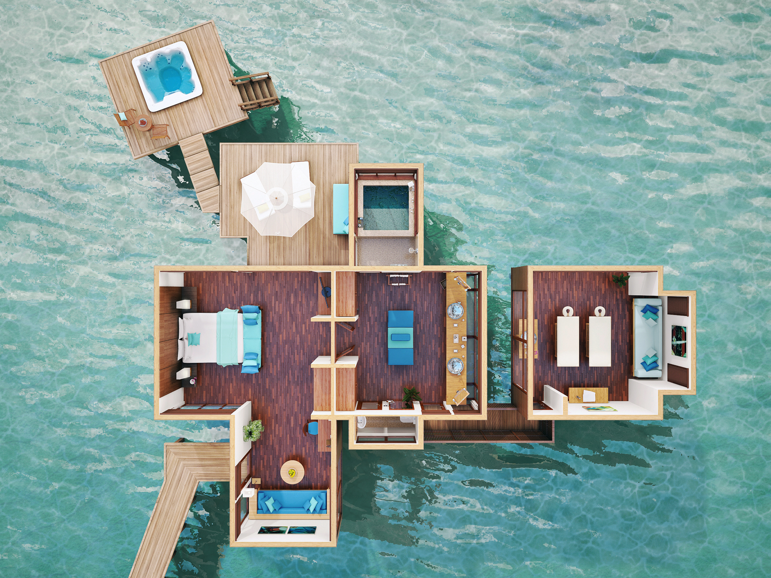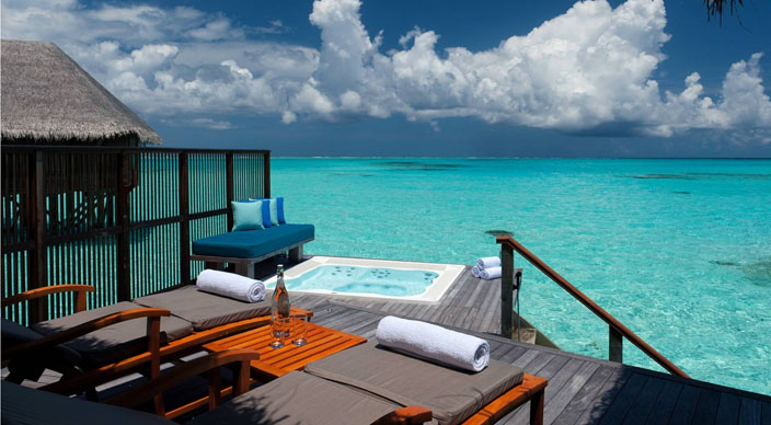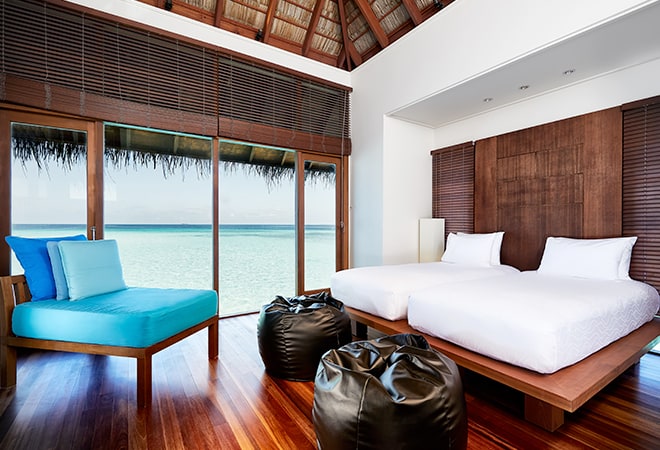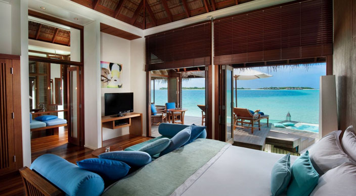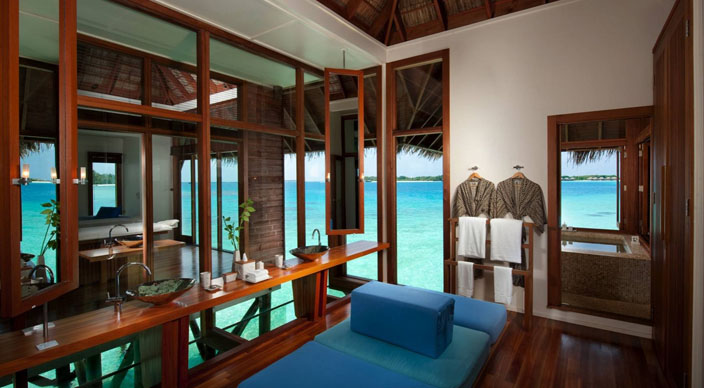 酒店的21间豪华水疗水上别墅(150平米)位于酒店礁湖的私密一隅,装修设计舒适似家,是放松身体、慰藉心灵的最佳之所。别墅围绕着Spa Retreat水疗区而建,在蔚蓝清澈的波浪之上铺陈开来,每一间都是一个远离尘嚣的世外幽居。此外,每间别墅内设的专属独立水疗护理室内均配有两张按摩床、迷你健身房及健身球等设施。 宽敞的空间设计与淡入淡出的马尔代夫现代风格和谐而统一,淳朴的木质内饰、茅草屋顶以及穿窗而过的习习凉风让人仿佛置身于人间天堂。房中随处都可饱览无敌海景,让宾客时刻拥有与自然融为一体之感。