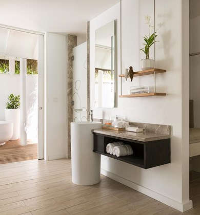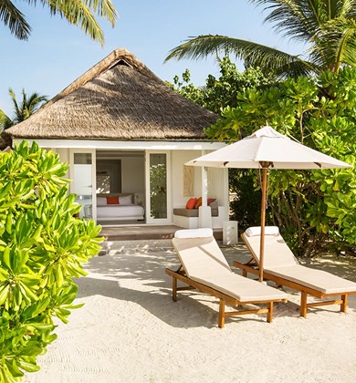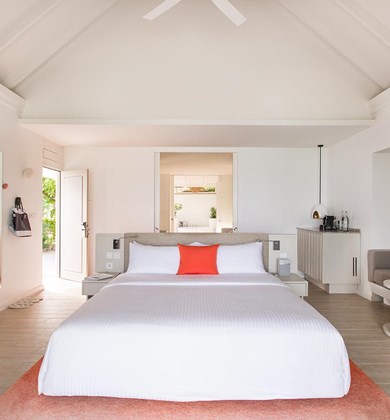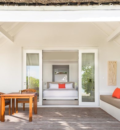 从露台上能看到美丽的岛屿以及纯白色的沙滩,房间拥有淡橘黄色调的精妙装饰与潮起潮落遥相呼应。所有的客房都有配套的露天浴室,一望无际的天空、鲜艳夺目的木槿花、迷人的香蕉树,这一切成就了自然环境中的私密空间。