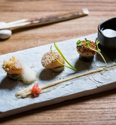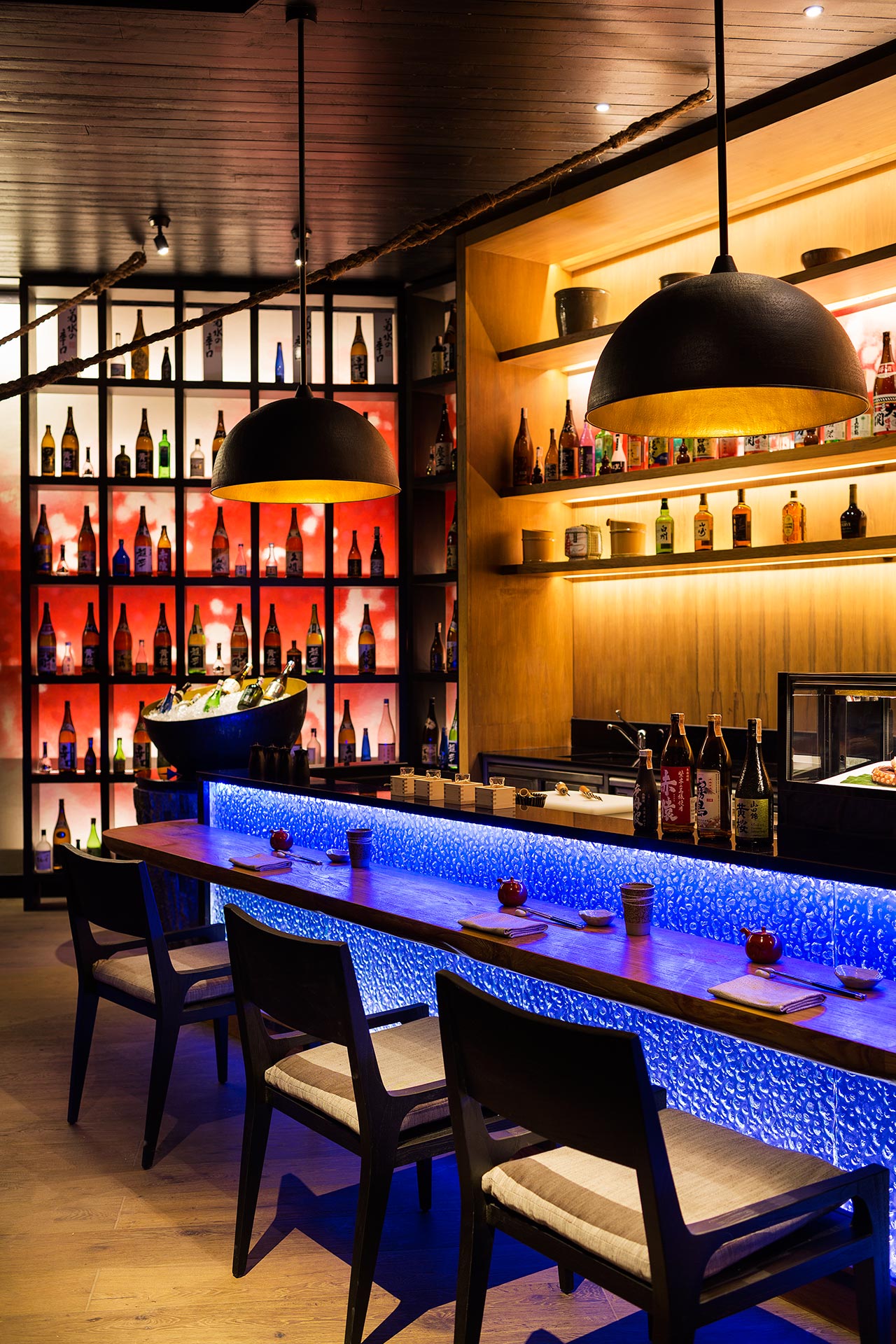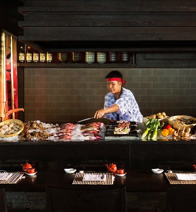 酒类鉴赏行家们可在此享用30种日式清酒及9种高级日式威士忌,感受难以忘怀。在炉端烧烤炉前,如同最为挑剔的享乐主义者一般,大快朵颐神户牛肉或澳洲羊肉,主厨叹为观止的铁板烧技能则将给你带来更多视觉冲击。