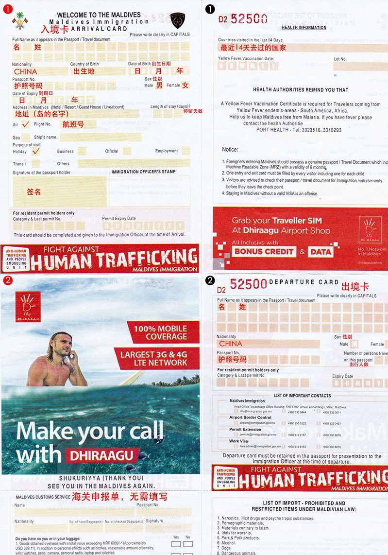 一般在从国内飞往马尔代夫的飞机快要抵达马尔代夫前,机上的乘务员会给乘客依次发放入境表,乘客可以选择在飞机上填写入境表,如果觉得不是很方便,也可以在机场进行填写。具体入境表填写哪些内容和填写规则可以参考上面的图片。填写完成后,入境表无需交回,先自己带着。建议在飞机填写相关信息,如果某项信息填写错误的话,可以向机上乘务员重新要一份。