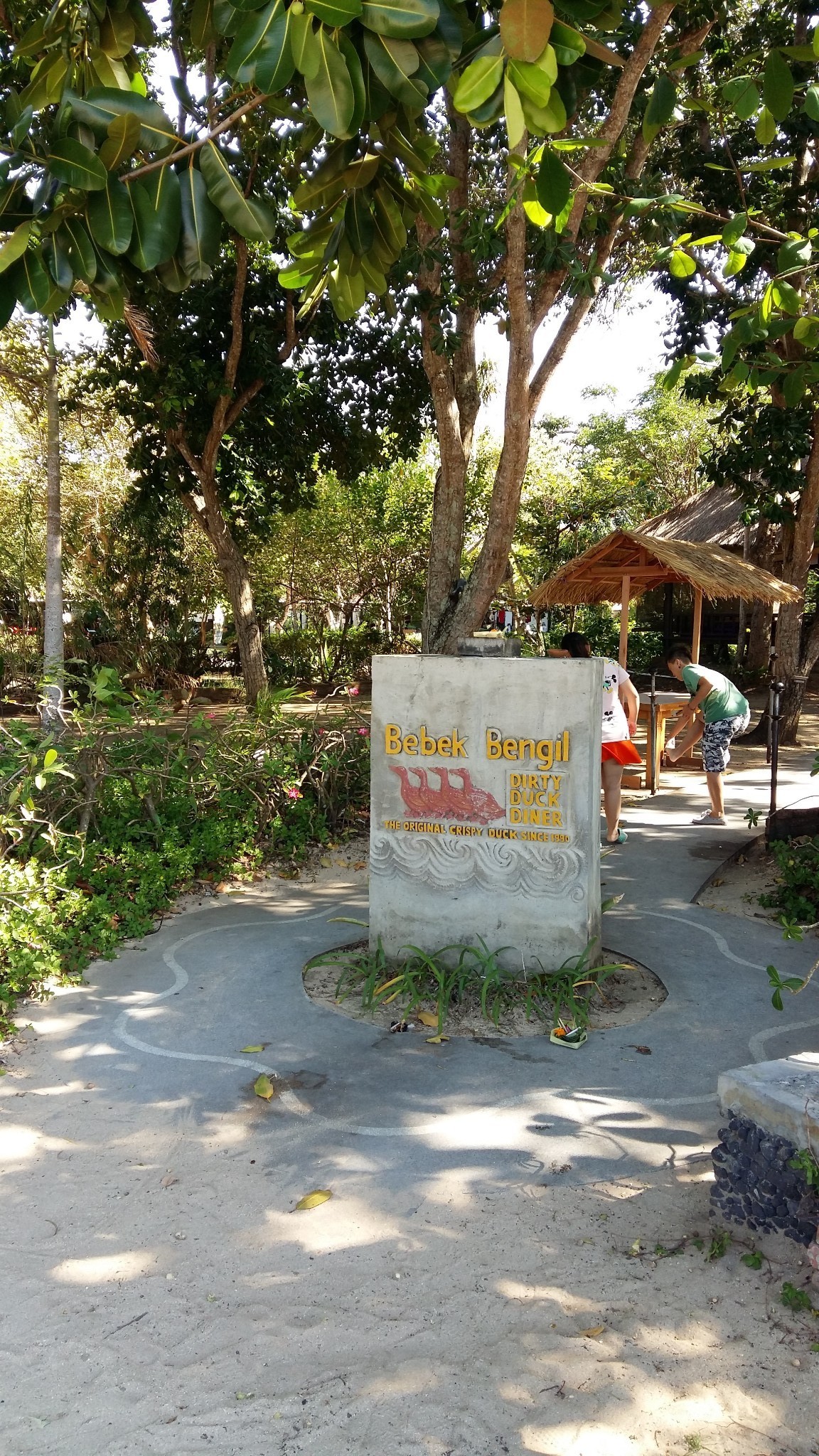 Bebek Bengil 在努沙杜瓦的分店,这家店很大,就在bali collection后面,门口就是旅游团上下车点,沿着海滩一直走也可以找到。有很多旅游团的客人在此就餐。这家店也有沙滩,可以在室内大堂吃也可以在外面的卡座(就是一个个小亭子),还有沙滩上的凉亭里。
