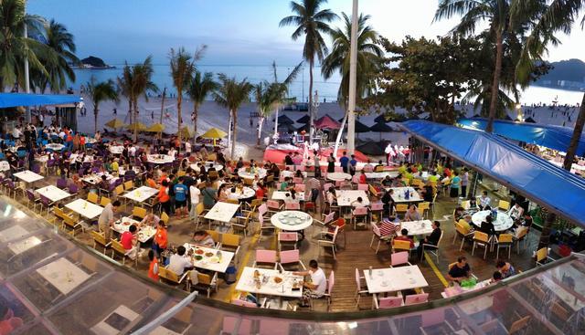 大东海 - 南中国海鲜广场,位于南中国酒店旁沙滩处,也就是大东海海水浴场( 大东海广场左侧海滩),这里应该是三亚最美吃海鲜的地儿了,因为还可以有晚霞、有沙滩、在海边。