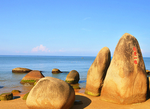 天涯海角陆地面积为10.4平方公里,海域面积6平方公里,背对马岭山,面向茫茫大海,是海南建省20年第一旅游名胜。这里海水澄碧, 烟波浩瀚,帆影点点,椰林婆娑,奇石林立水天一色。海湾沙滩上大小百块石耸立,“天涯石”、“海角石”、“日月石”和“南天一柱”突兀其间,昂首天外,峥嵘壮观。天涯海角景区海湾、沙滩上大小百块磊石耸立,上有众多石刻。清康熙五十三年(1714年)钦差大臣苗曹汤巡边至此,勒石镌字“海判南天”,这是天涯海角最早的石刻。“海判南天”石刻对面,有一尊高约7米雄峙于大海的圆锥形巨石,为著名的“南天一柱”景观,“南天一柱”四个大字是清代宣统元年(1909年)崖州知州范云梯题刻。