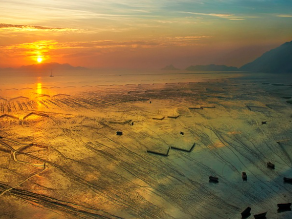 沙塘里村面向福宁湾,视野开阔。当日出时,满天绚丽的朝霞,反射到“人”字形围网滩涂上,产生五彩斑斓的暖色光纹,所以是不折不扣拍摄日出的最佳景点之一。停泊在海湾滩涂上的数百只小渔船在朝霞的渲染下也十分壮观。
