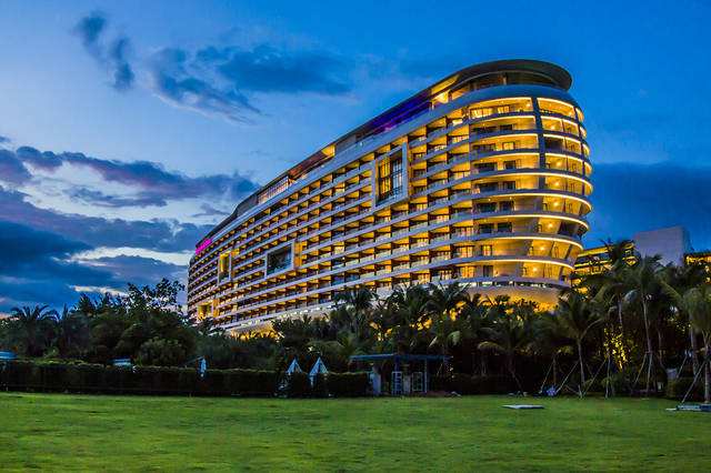 酒店外观犹如一艘邮轮,其设计理念来源于即将扬帆起航的邮轮。优美的弧线体量,通过木材,天然石材,白色铝板的有机组合。将色彩、造型、体量、比例、风格与周围环境协调。利用围合和渗透的手法,以期达到室内外空间的连续流动,融为一体的最佳效果。创造出整体协调统一的具有浓厚的热带地方特色的建筑形象。每个房间都是海景房,尤其是傍晚客房的灯光亮起来,特别像一艘行驶在海棠湾的轮船!在岸上就能体验浪漫的邮轮之旅!