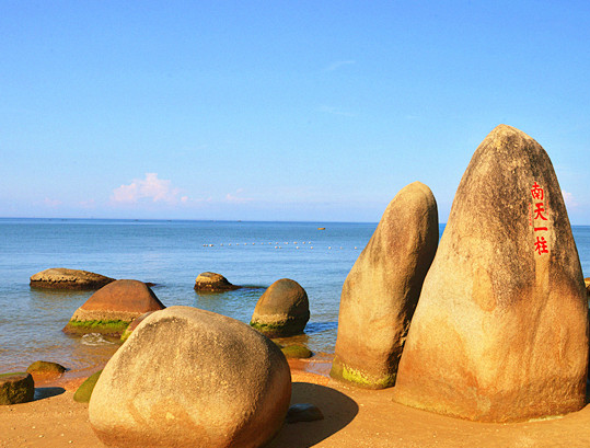 天涯海角游览区天涯海角位于三亚市区西南23公里处,以美丽迷人的热带海滨自然风光、悠久独特的历史文化而驰名中外。天涯海角陆地面积为10.4平方公里,海域面积6平方公里,背对马岭山,面向茫茫大海,是海南建省20年第一旅游名胜。这里海水澄碧, 烟波浩瀚,帆影点点,椰林婆娑,奇石林立水天一色。海湾沙滩上大小百块石耸立,“天涯石”、“海角石”、“日月石”和“南天一柱”突兀其间,昂首天外,峥嵘壮观。天涯海角景区海湾、沙滩上大小百块磊石耸立,上有众多石刻。