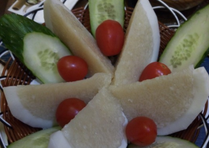 竹筒饭,用山兰稻(一种旱稻)“香米”配肉类为原料,放进新鲜的粉竹或山竹锯成的竹筒中,加适量的水,再用香蕉叶将竹筒口堵严,炭火中绿竹烤焦即可。竹筒饭的煮法颇具有野炊特点,即砍下一节竹筒 ,装进适量的山兰米和水,放在火堆中烤熟,当竹筒表层烧焦时,饭就熟了。劈开竹筒,米饭被竹膜所包,香软可口,有香竹之清香和米饭之芬芳。用餐时破开竹筒取出饭,这便是有名的“竹筒香饭”。如果把猪瘦肉混以香糯米和适量盐巴放进竹筒烤成香糯饭,异香扑鼻,是招待贵宾的珍贵美食品。