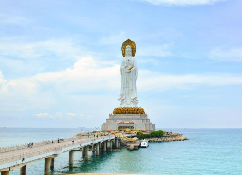 海上观音是三面观音为一体的三尊造型佛像。正面观音手持经箧,右面观音手持莲花,左面观音手持念珠,依次象征智慧、平安、仁慈。每一尊法相皆蕴含一种大智慧,能增福添慧、保佑平安。