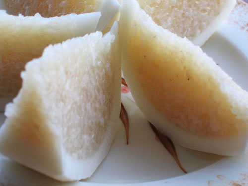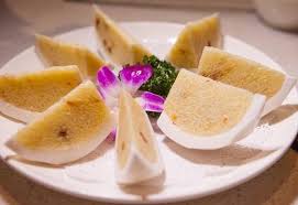 3、待煮熟的糯米椰盅自然冷 却后,用刀顺直势解成若干块两头尖、中间宽的船形块件,装盘即成。