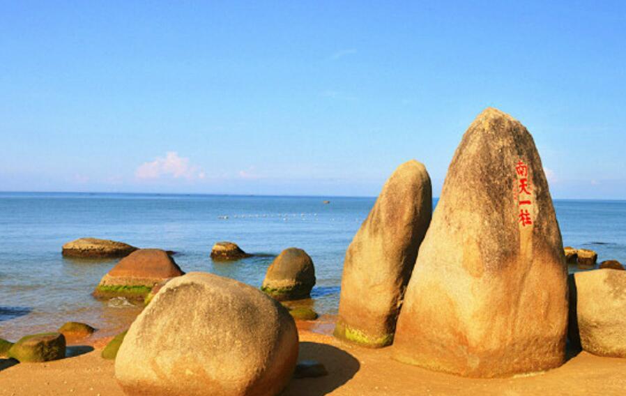 天涯海角游览区内碧海、青山、白沙、礁盘浑然一体,宛若七彩交融的丹青画屏;椰林、波涛、渔帆、鸥燕、云霞辉映点衬,形成南国特有的椰风海韵。 图片依次分别为天涯石,海角石,日月石,南天一柱石,海判南天石。