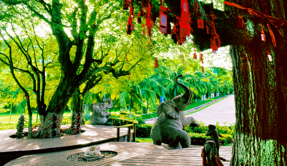 在“群象雕塑”景点,十二头栩栩如生的石雕大象,形态各异,是大人小孩享乐的好去处。据佛经记载,释迦牟尼前生曾为六牙白象,因此,象历来被视为佛教的吉祥物。在这里,十二头大象代表着一年十二个月,寓意着月月吉祥。