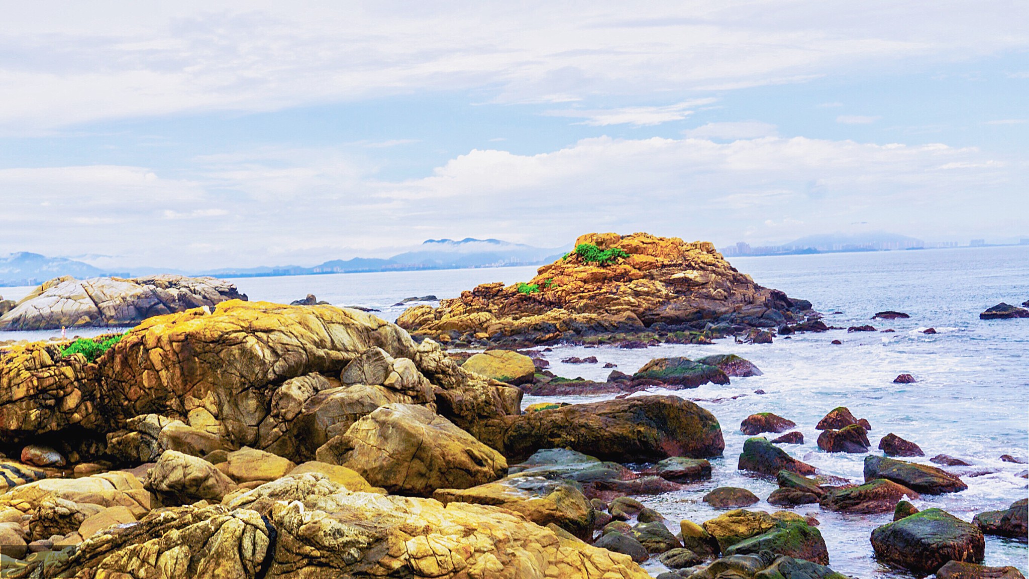 临海山石嶙峋陡峭,直插海底,惊涛拍岸,蔚为壮观。中部山林草地起伏逶迤,绿影婆娑。北部滩平浪静,沙质洁白细腻,恍若玉带天成。