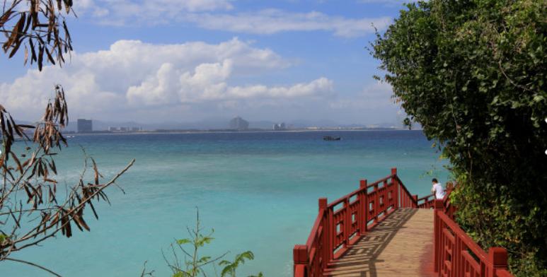 :位于蜈支洲岛东北侧,沿海边地形修建了一条木质走廊,沿途设有观海平台,可以沿着走廊观看蜈支洲岛美丽的海景。由于这一带礁石比较多,可以欣赏海浪拍打礁石的景象,也可以看到许多螃蟹在礁石上“横行”。如果运气好,在平台上还可以看到成群的热带鱼在清澈的海水中畅游。
