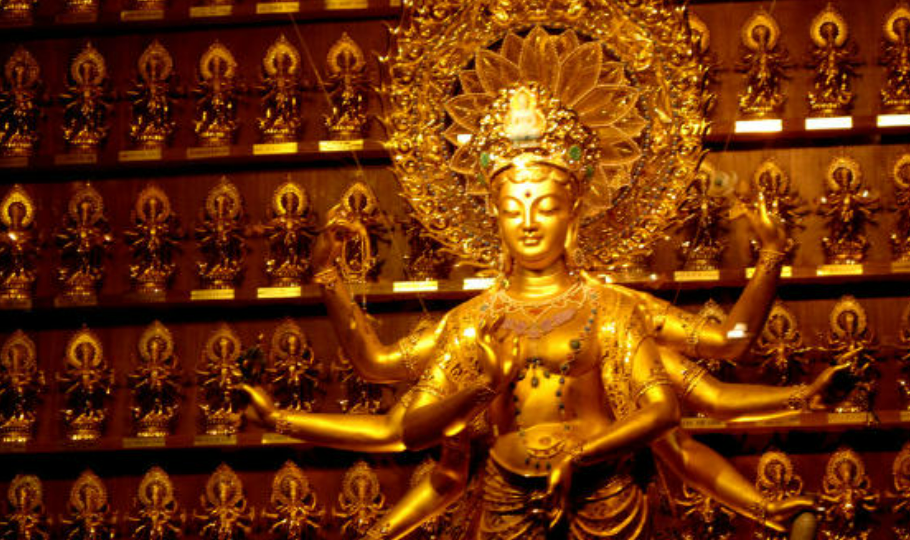 举世闻名的“金玉观音”供奉在金碧辉煌的“得在自在观音阁”里。这尊观世音雕像内镶释迦牟尼舍利子,通身像高3.8米,由观音金身、佛光、千叶宝莲、紫檀木雕须弥底座四部分组成,耗用黄金100多公斤、120多克拉南非钻石、数千粒红蓝宝石、祖母绿、珊瑚、松石、珍珠及100多公斤翠玉等奇珍异宝,采用中国传统“宫廷金细工”手工艺制造。