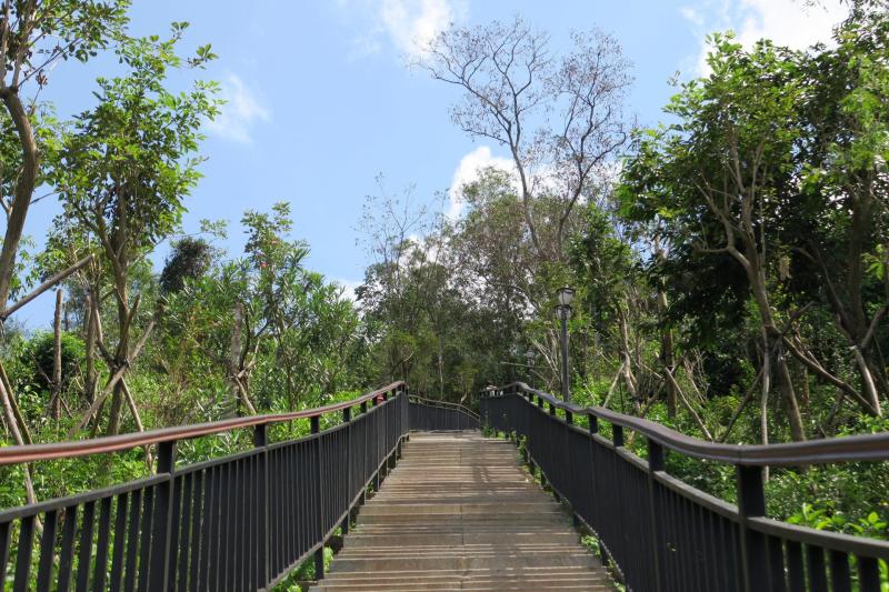 金鸡岭桥头公园建成为健身休闲带、湿地花园区、中心广场区、体育运动区及红树林带五大区,融入休闲娱乐、康体健身、科普教育、生态展示等多种功能的城市滨河公园。在河两岸以红树林为主体的湿生植物,配以观赏性湿生、水生植物,打造自然式堤岸,沿岸水草丛生,打造生态型的湿地景观。三大景观效果,打造“移步移景,一步一画”的美丽公园风光带。