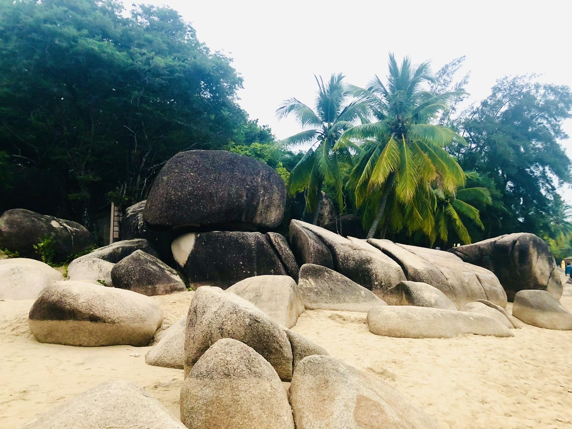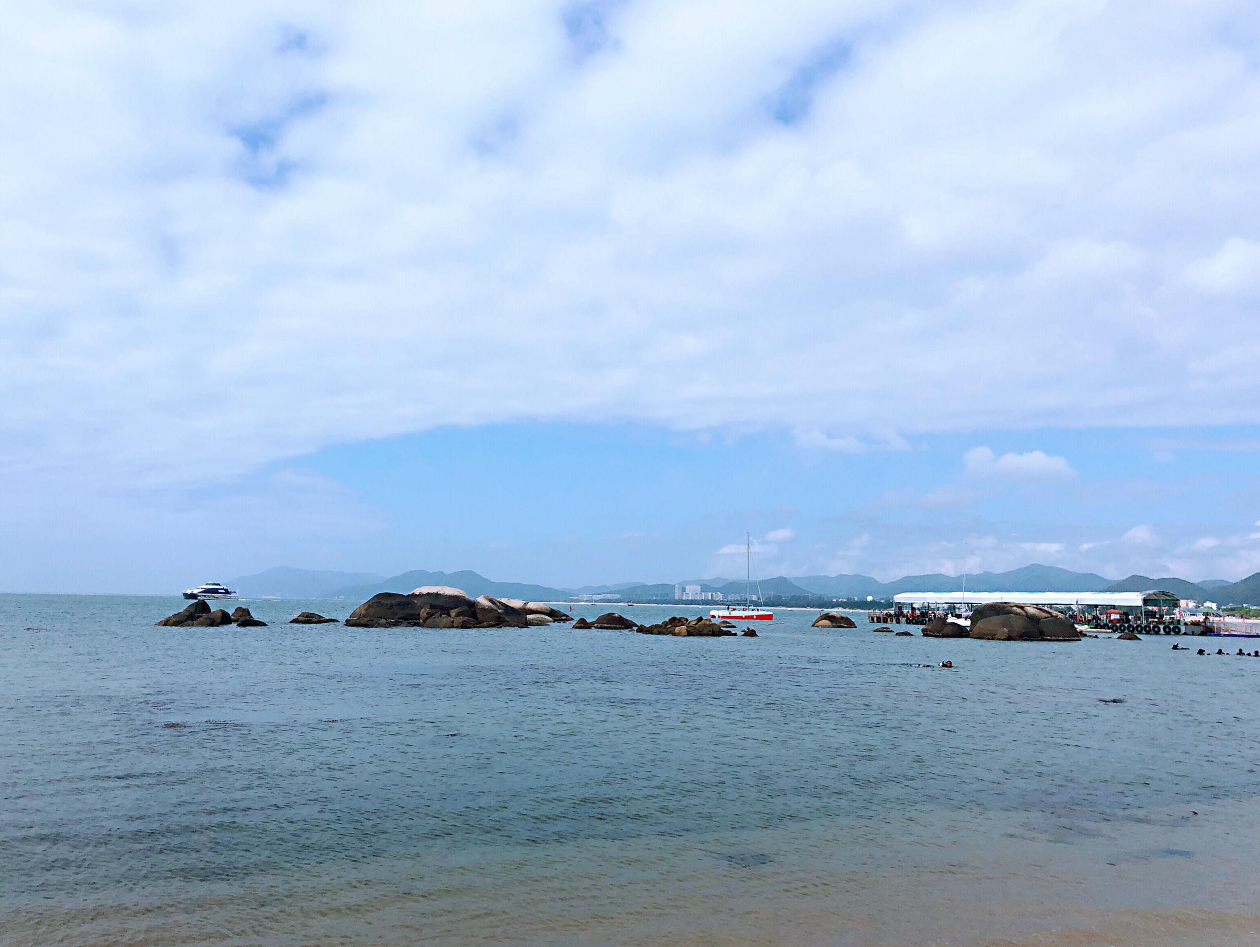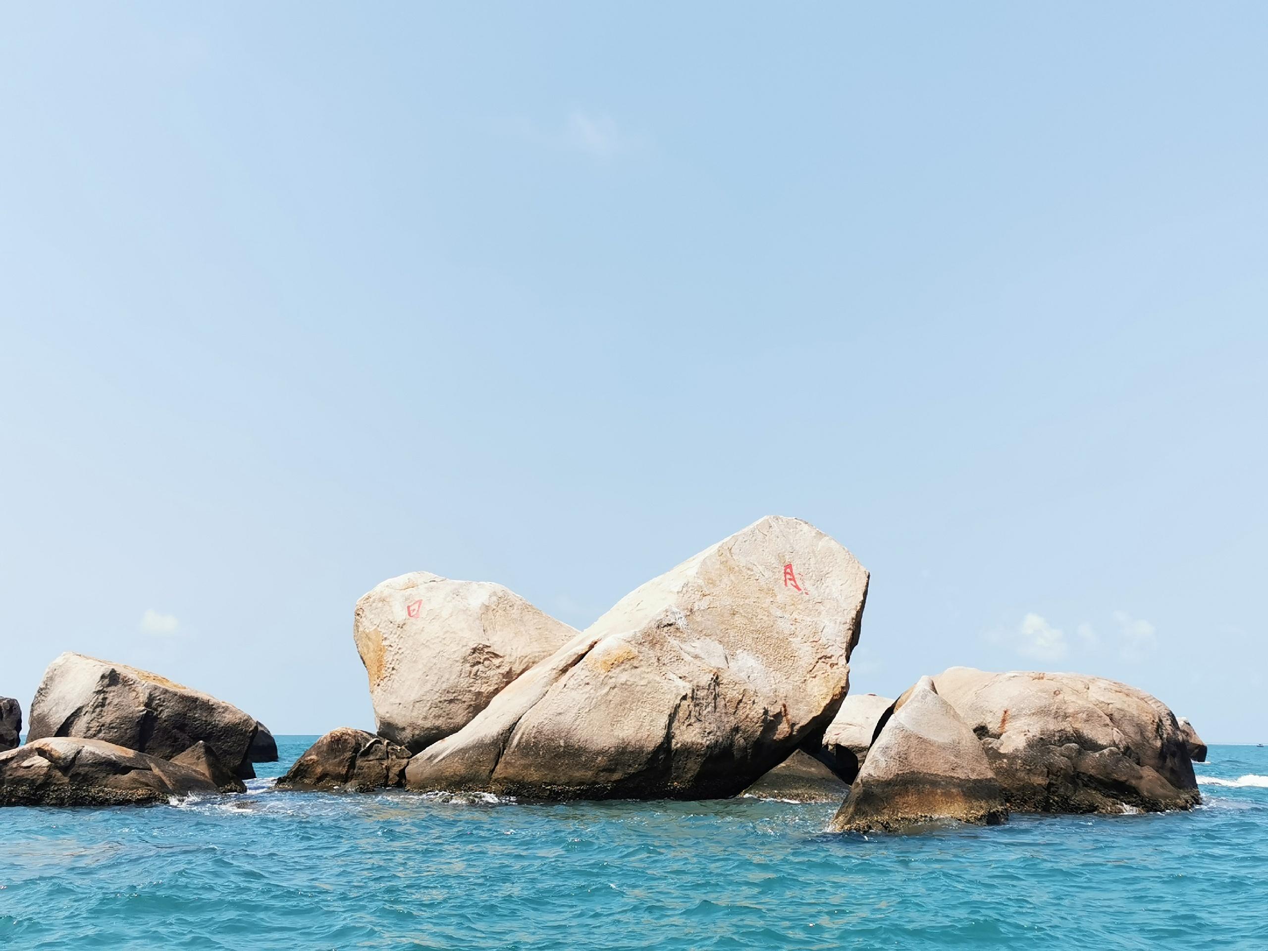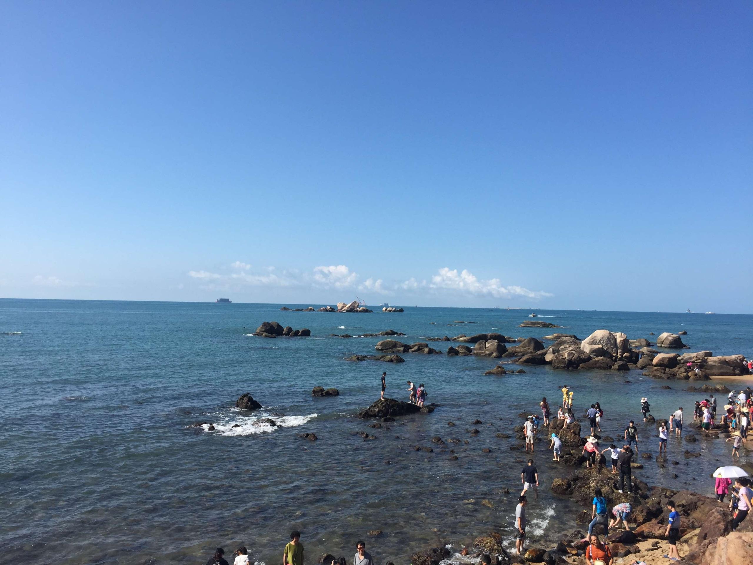 这里海水澄碧,烟波浩瀚,帆影点点,椰林婆娑,奇石林立水天一色。海湾沙滩上大小百块石耸立,“天涯石”、“海角石”、“日月石”和“南天一柱”突兀其间,昂首天外,峥嵘壮观。天涯海角景区海湾、沙滩上大小百块磊石耸立,上有众多石刻。