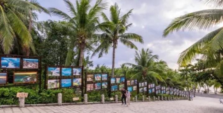 天工造化,鳌山云深林翠;人文点缀,南海涛声动情。椰风挑动银浪,夕阳躲云偷看,南海姑娘的歌声里,山高水长,天人合一,相约相聚,流连忘返。