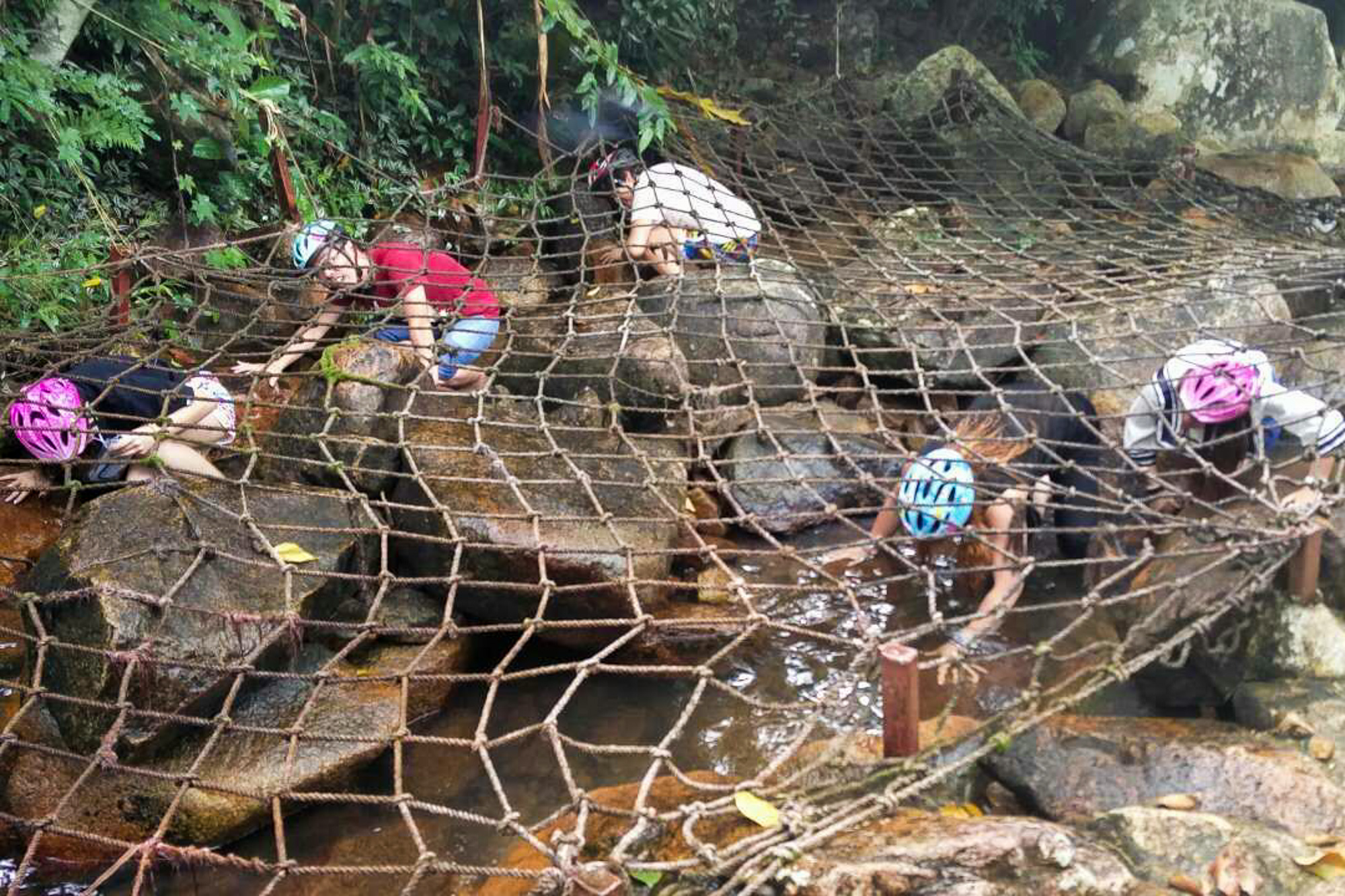 不包含在门票内,可选择性付费参加。参与者穿上草鞋、戴上头盔,在景区内的一条幽深的峡谷内“跋山涉水”,攀爬瀑布、走过摇晃桥、穿越低桩网等,全程需过8个关卡,整个流程花费时间约70-90分钟。如果遇到有不敢尝试的关卡项目,可以走旁边的小路绕到关卡前方,等到所有队员通过后,再一起参加下一个项目。每一个队都会配一个领队,负责大家的安全。