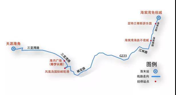 经停站点:海棠湾免税城、亚特兰蒂斯游乐园、海棠湾海昌不夜城、 夏日百货、三亚游船旅游中心、市委(时代海岸)、解放路步行街、凤凰岛国际邮轮港、海月广场(椰梦长廊)、美丽新海岸、国光滨海花园、三亚湾假日酒店、天涯海角。