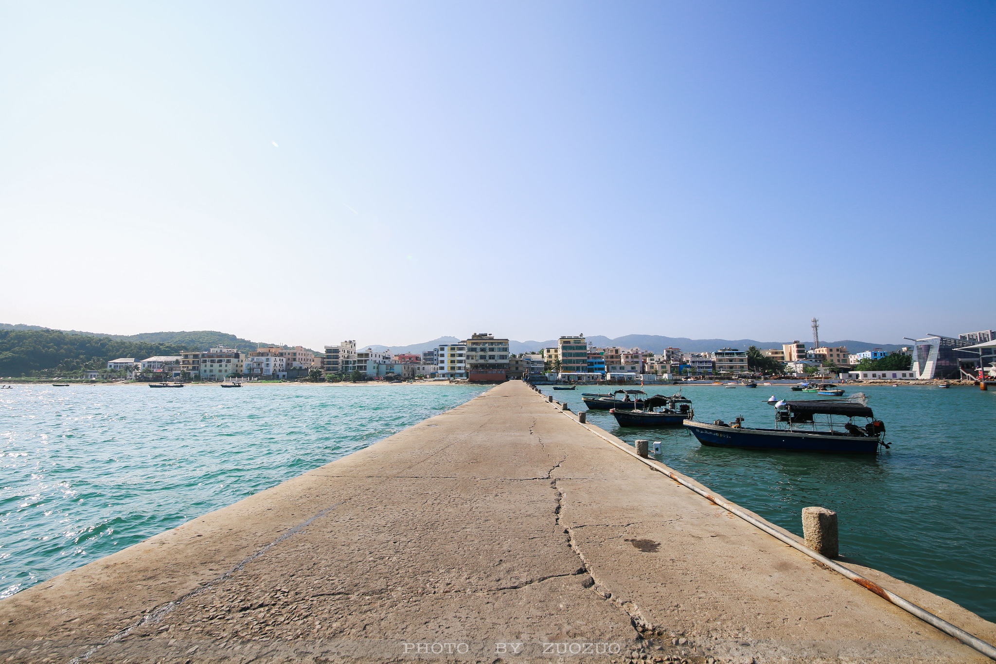 ·后海与北面的蜈支洲岛遥相辉映,蜈支洲岛的上岛码头就在这里,海湾入口处有白色的灯塔。