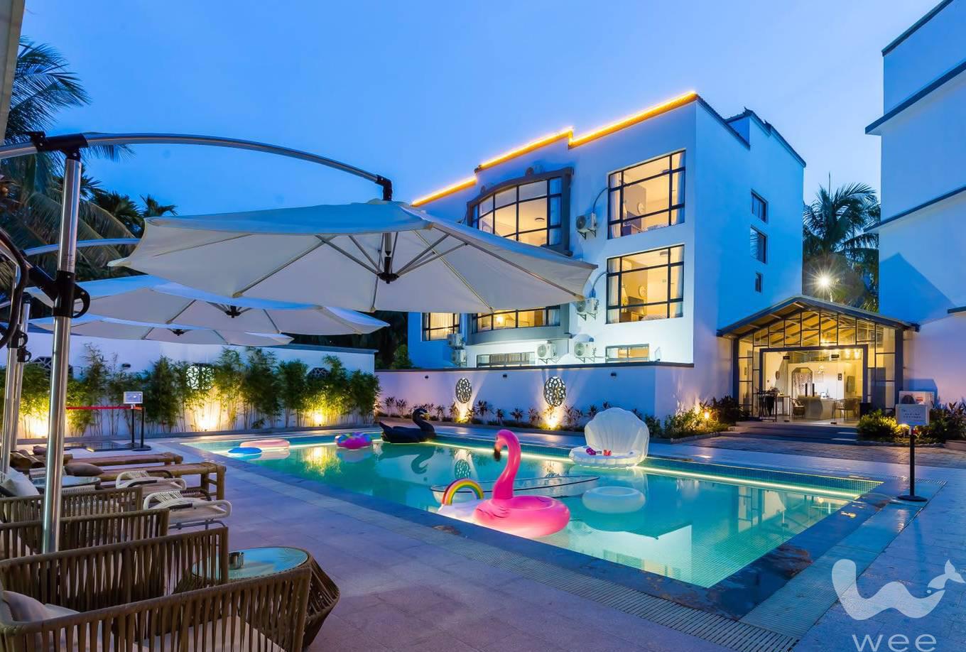 三亚亚龙湾朋泊乐青奢宿设计美宿坐落在三亚亚龙湾旅游风景区的博后村,依托“天下第一湾”亚龙湾得天独厚的海滨资源优势和“五A级美丽乡村”博后村的美丽乡村优势,亚龙湾朋泊乐青奢宿于2018年选址在博后村新坡一队十六号符万里宅邸。青奢宿毗邻街区主干道,侧面是一乡间小道,占地共有二千多平方米,穿过园林是两栋主体建筑,便利不失静谧,足够大的空间宜动静结合。设计师结合院落自然状况和经营者中国风的情愫,把两栋主体建筑改造成了白墙灰瓦新中式风,中式庭院大门掩映在原有茂盛的腰果树下,从月洞玄关看过去,葱郁的竹林通道隐秘通幽,庭院内挺拔婀娜的槟榔林硕果累累,菠萝蜜树上大大的果实神秘又好奇,大人小孩在泳池内嬉戏,身着汉服的小哥小姐弹筝拍照,古井旁客人在品茶闲聊,泳池旁的躺椅上客人悠闲小憩。客房内双层隔音玻璃、科勒卫浴、高端品牌洗浴用品、高星级标准的纯棉贡缎床品、乳胶床垫、客房卫生、泳池卫生、园区卫生及餐厅卫生均按照高星级标准对服务员进行培训和要求,餐厅提供海鲜加工服务:价格低、服务好,口味赞,力争让客人在体验高端酒店的硬件及卫生标准的同时,但又特享传统酒店没办法做到的民宿主人文化服务。