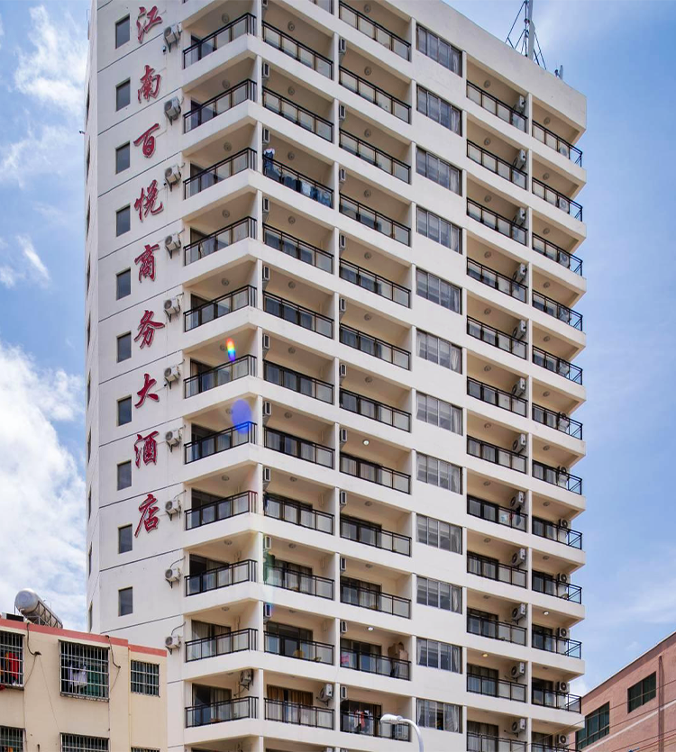 三亚江南百悦商务大酒店座落在三亚市迎宾路上,项目占地面积700平方米,建筑楼高为15层,总建筑面积约8000平方米;酒店按照国家星级的标准设计建造,风格独具匠心,装饰豪华典雅,是集餐饮、客房、茶吧等功能于一体的商务度假酒店。