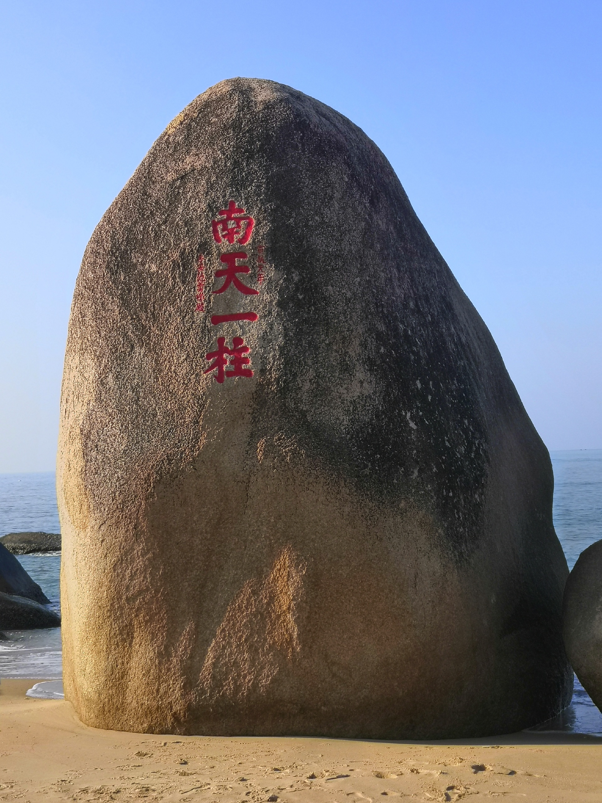 天涯海角南天一柱位于海南三亚市。从“天涯”“海角”二石东走约三百米,一尊高大兀立的圆锥形奇石,象一支神笔直指苍穹,这便是“南天一柱”石,高约7米,正面看像一颗哲人的头颅,侧面看像一艘古船上升起的“双桅帆”。第四版2元人民币背面的图案就是这里的“南天一柱”。