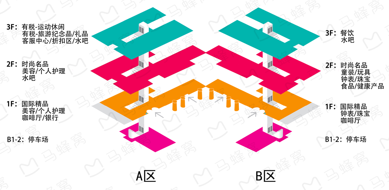 A区主要经营化妆品、箱包、服装和珠宝等。第1层设有咖啡厅和农商银行,第3层除了客服及VIP中心、儿童乐园和折扣区(过季、断码或促销的免税名品),在有税区(不离岛、无机票也可购买)还售卖海南特产和旅游纪念品等。