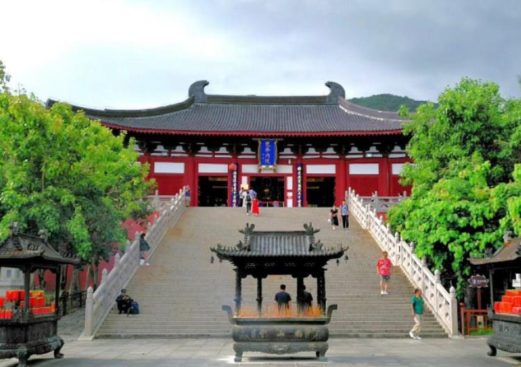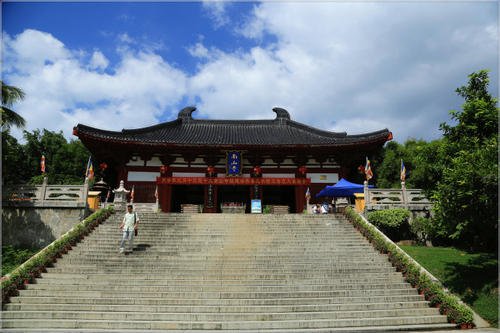 南山寺位于海南三亚南山文化旅游区,是一座仿古盛唐风格的寺院。这座寺庙的规模很大,整体气势恢宏。寺院建有仁王殿、大雄宝殿、东西配殿、钟鼓楼、转轮藏等,分别供奉门神哼哈二将、释迦牟尼佛、阿弥陀佛和药师佛、十六罗汉。