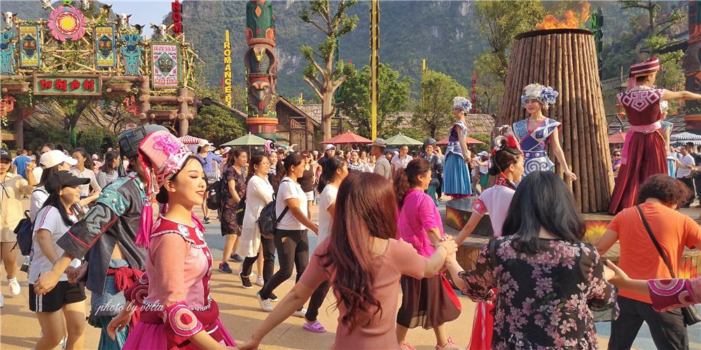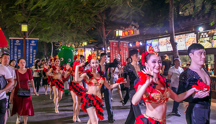 这是一场激情的街头快闪,西域女郎、草裙美女、黎族阿哥、苗家阿妹等身穿各民族服饰帅哥美女与游客近距离亲密互动,大家一起踏起节拍、释放体能、挥洒激情!