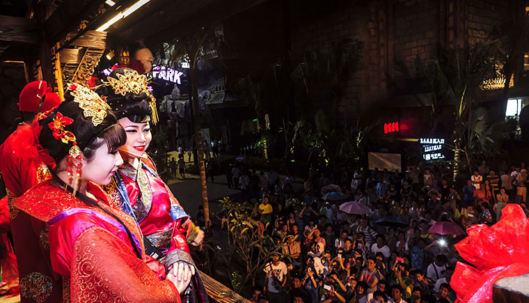 程知府是崖州大户人家,程家千金长得亭亭玉立、貌美如花,今日良辰吉日,在此抛绣球招婿。表演以一种轻松幽默、诙谐互动的形式,再现古代崖州婚礼习俗。