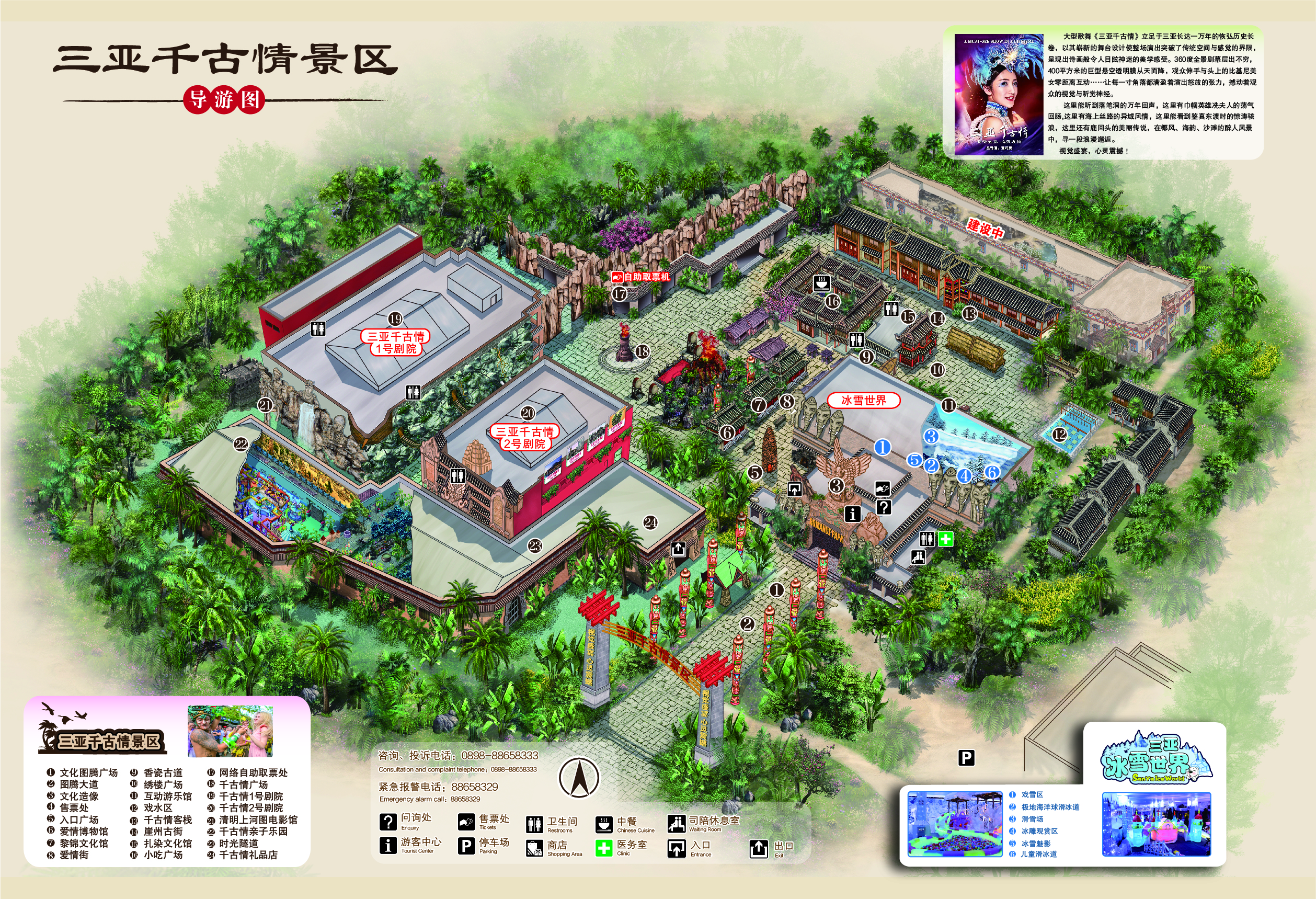 除了演出节目外,三亚千古情景区也有很多特色可看。三亚千古情景区是一座活着的黎苗古城,有彩色动物园、崖州古街、爱情街、黎村、苗寨、崖前街、室内高科技游乐综合体、黎村等数十个主题区。新增的风雨连廊贯穿园区,清凉户外喷雾系统全天开放,老少同乐、晴雨皆宜。