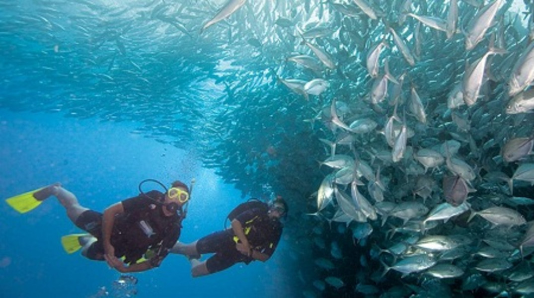 蜈支洲岛潜水海水能见度 6-27 米,海底生物丰富,海水清澈透明。蜈支洲岛是众多游客公认的海南潜水最好的地方,更享有"中国第一潜水基地"美誉。四周海域清澈透明,海水能见度 6~27 米,海底有着保护完好的珊瑚礁。同时岛上各种水上项目齐全,是整个海南玩水上项目最好,当然也是最贵的地方。